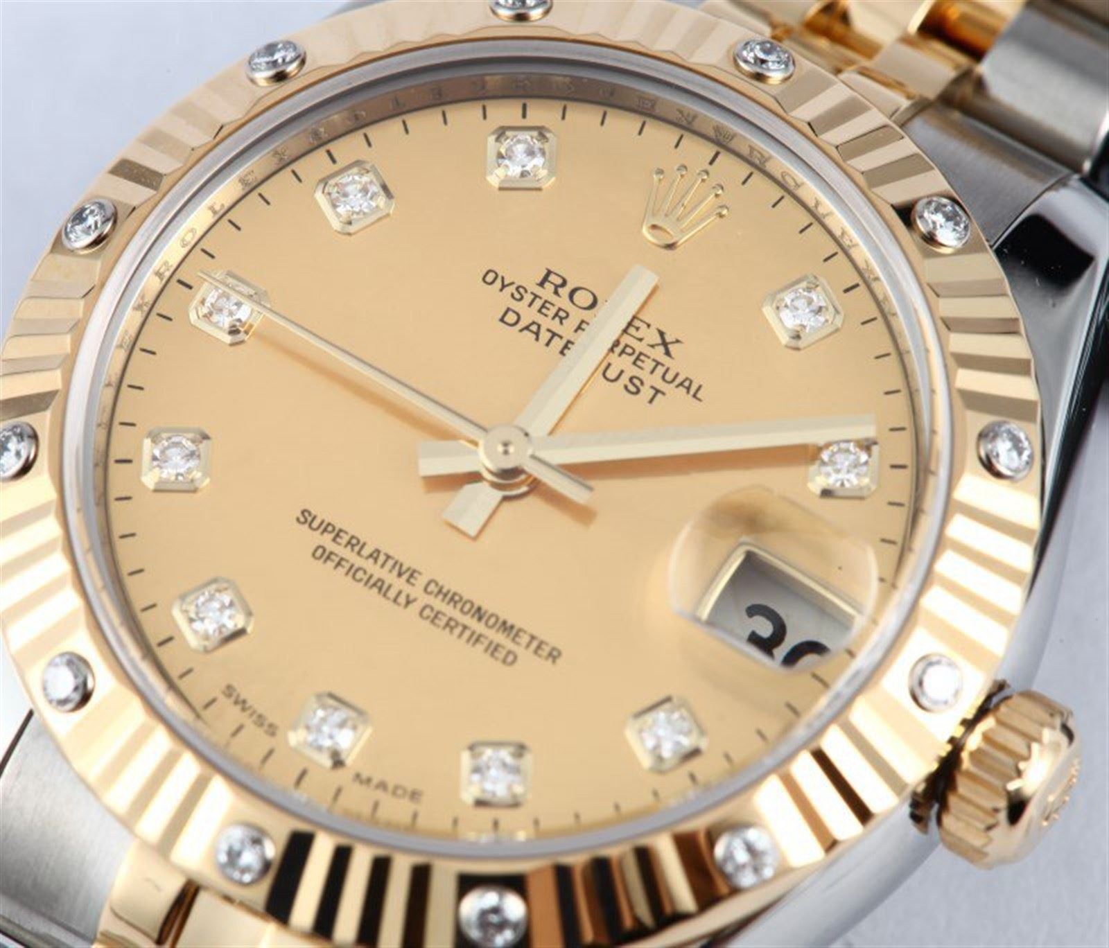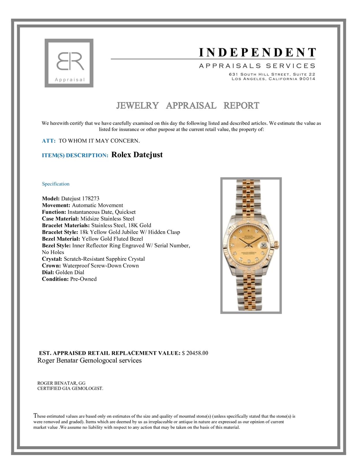 Model/Style-DateJust 178273 Serial/Year-Random Features-Automatic movement w/ date, Quickset, scratch-resistant sapphire crystal, waterproof screw-down crown Case-Midsize Stainless steel w/ yellow gold fluted bezel, inner reflector ring engraved w/ serial number, no holes Bracelet-Stainless steel and 18k yellow gold Jubilee w/ hidden clasp #9022