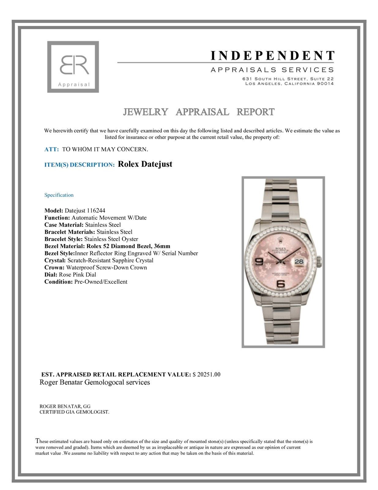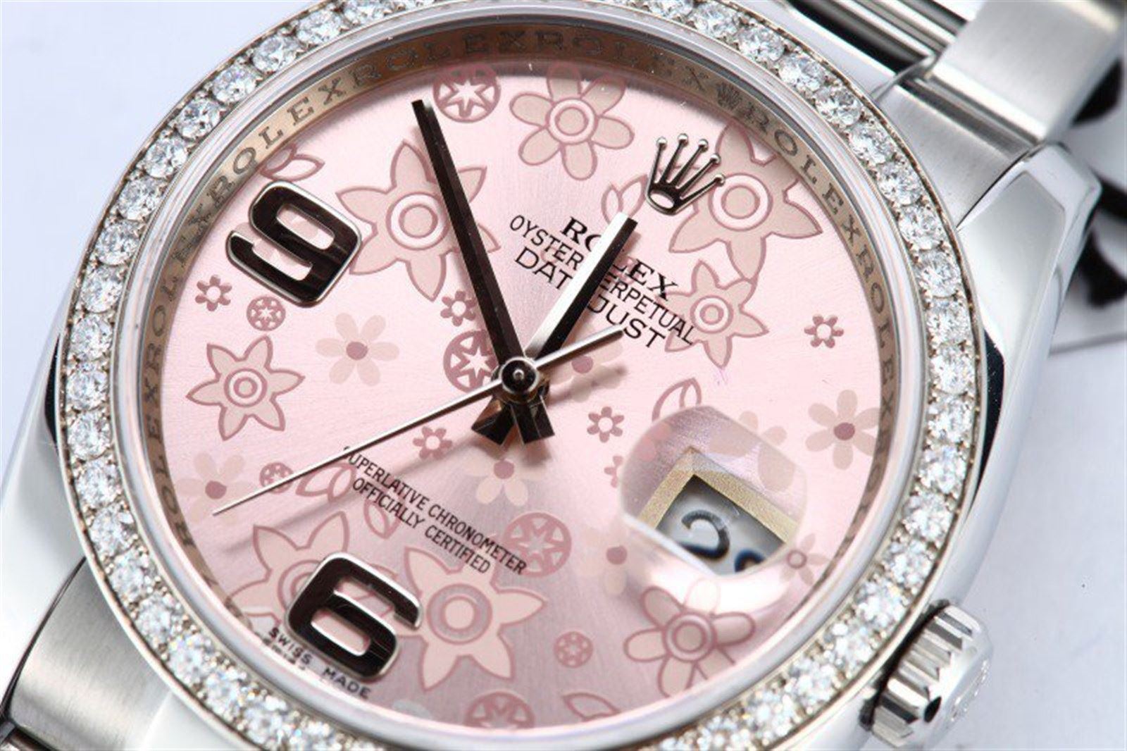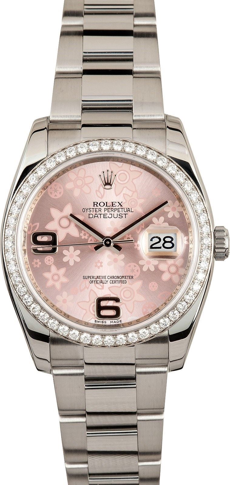 Model/Style-Datejust 116244 Features-Automatic movement w/date, scratch-resistant sapphire crystal, waterproof screw-down crown Case-Stainless steel w/ Rolex 52 diamond bezel, 36mm, inner reflector ring engraved w/ serial number Bracelet-Stainless steel Oyster #9027