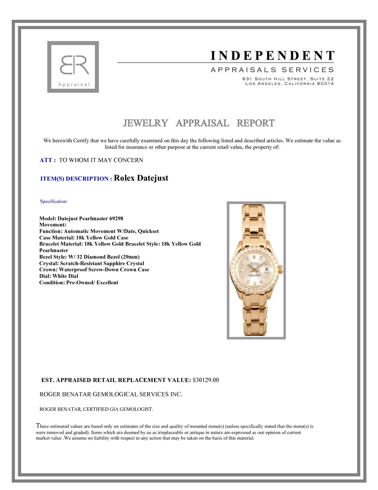Model/Style-Datejust Pearlmaster 69298 Features-Automatic movement w/ date, Quickset, scratch-resistant sapphire crystal, waterproof screw-down crown Case-18k yellow gold case w/ 32 diamond bezel (29mm) Bracelet-18k yellow gold Pearlmaster #9063