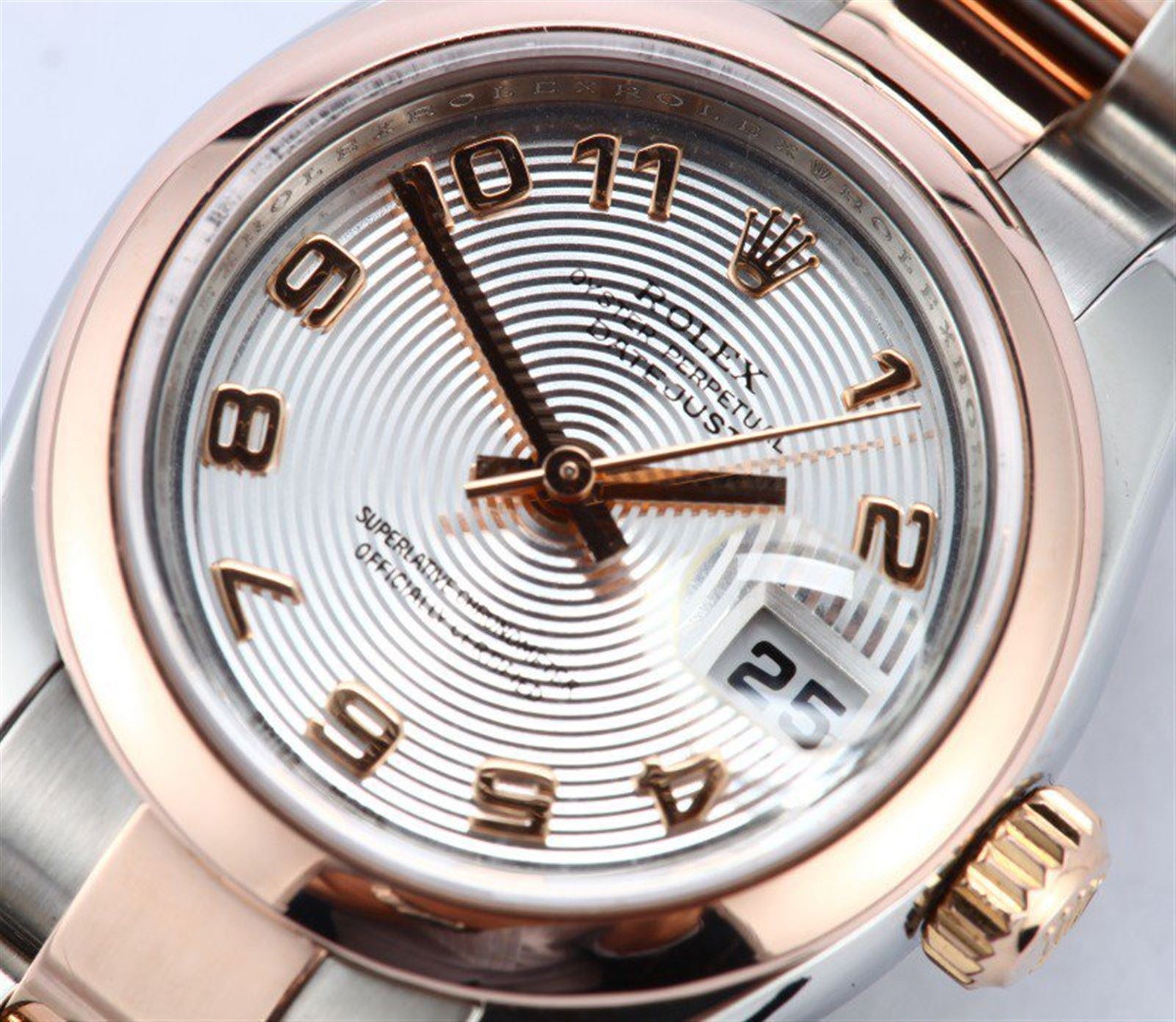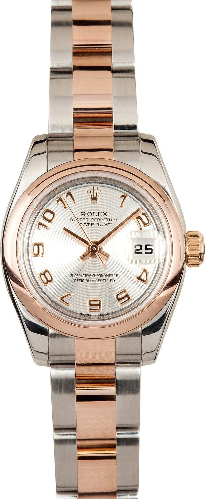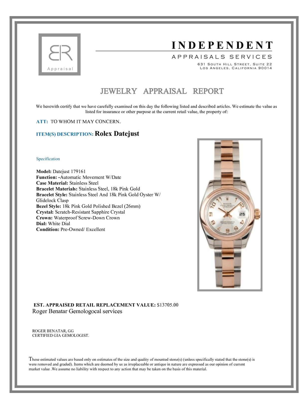 Model/Style-Datejust 179161 Features-Automatic movement w/date, scratch-resistant sapphire crystal, waterproof screw-down crown Case-Stainless steel w/ 18k pink gold polished bezel (26mm) Bracelet-Stainless steel and 18k pink gold Oyster w/ Glidelock clasp #9034
