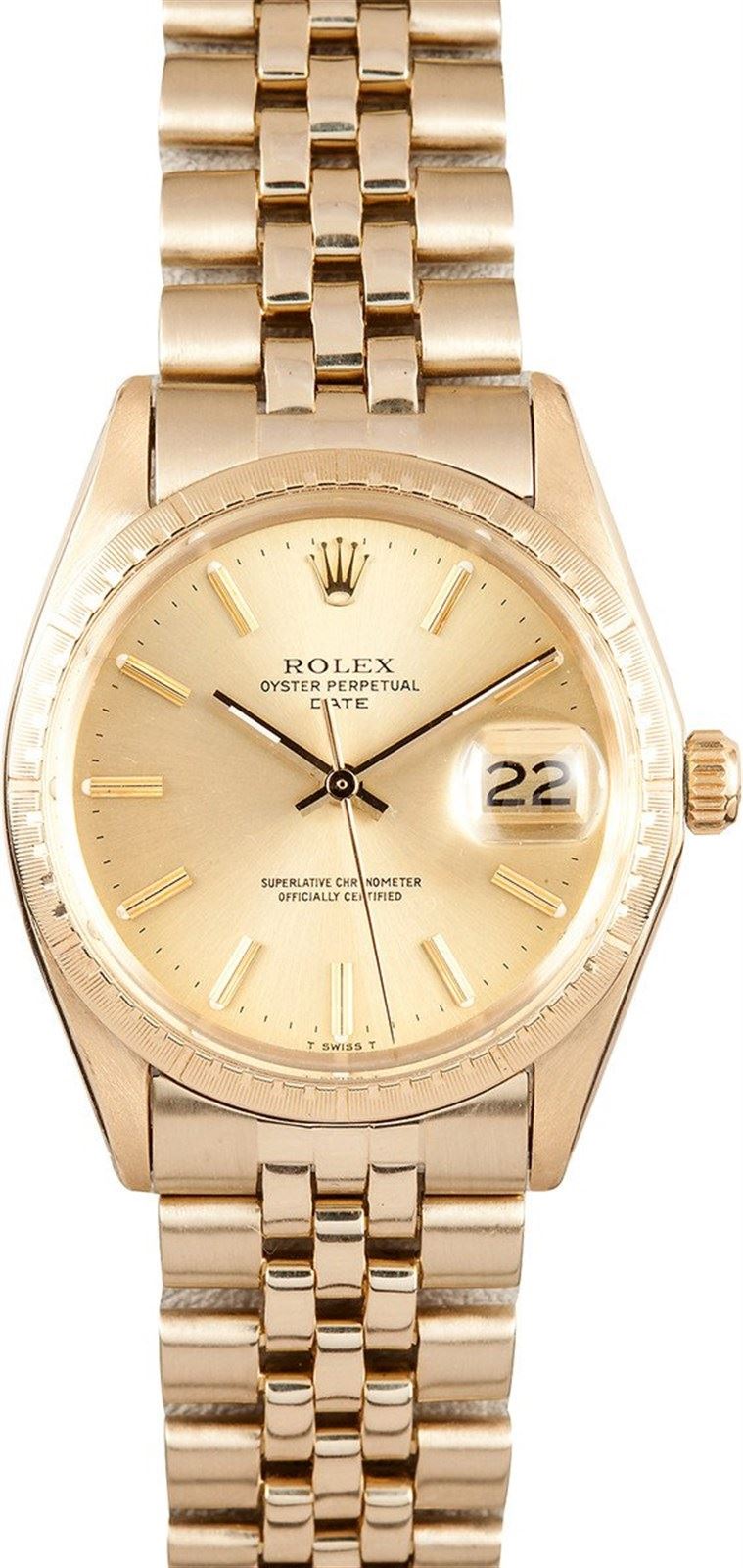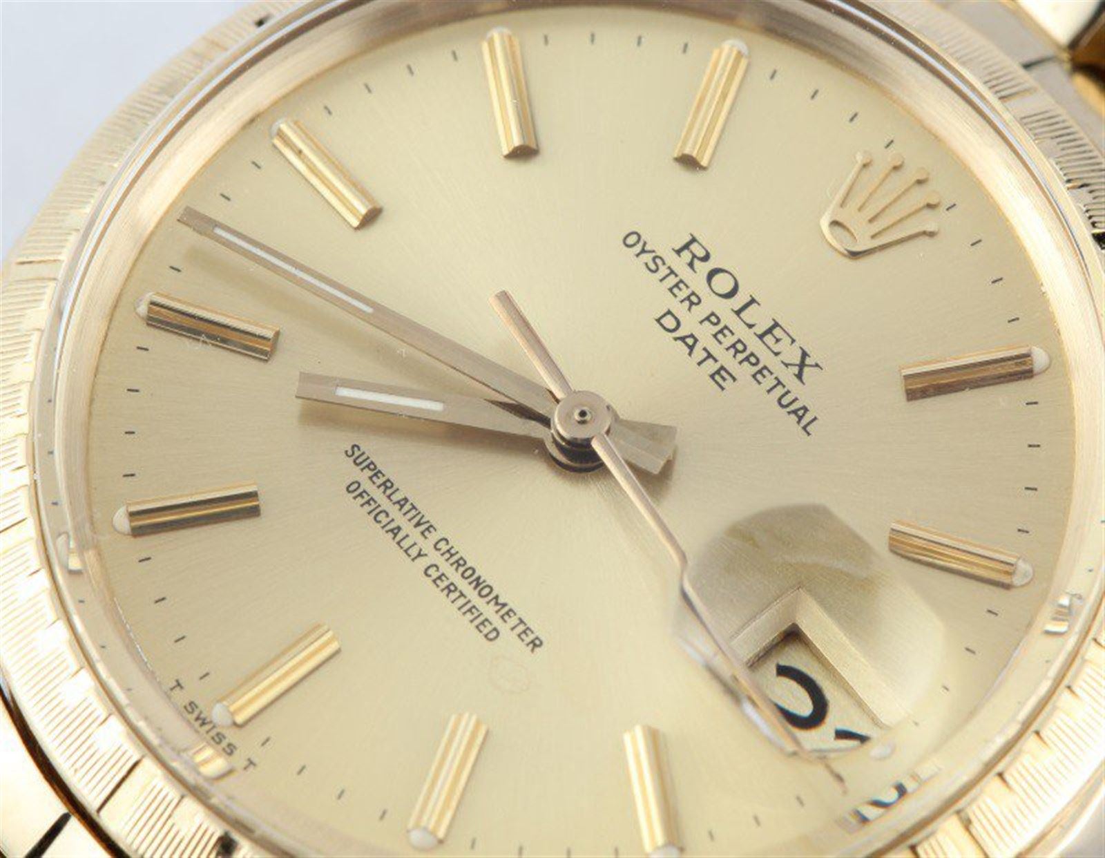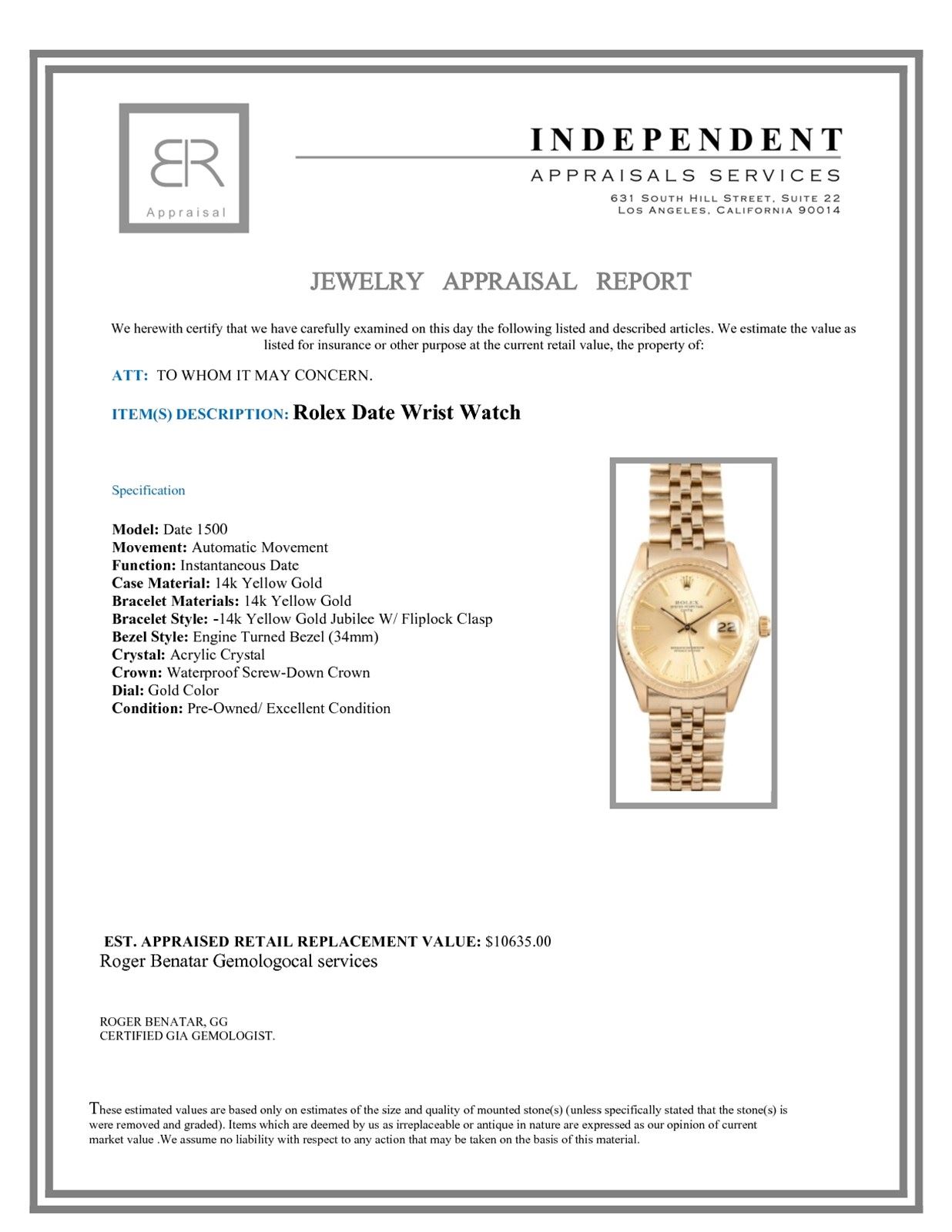 Model/Style-Date 1500 Serial/Year-Random Features-Automatic movement w/ date, acrylic crystal, waterproof screw-down crown Case-14k Yellow Gold w/ engine turned bezel (34mm) Bracelet-14k Yellow Gold Jubilee w/ fliplock clasp #9012