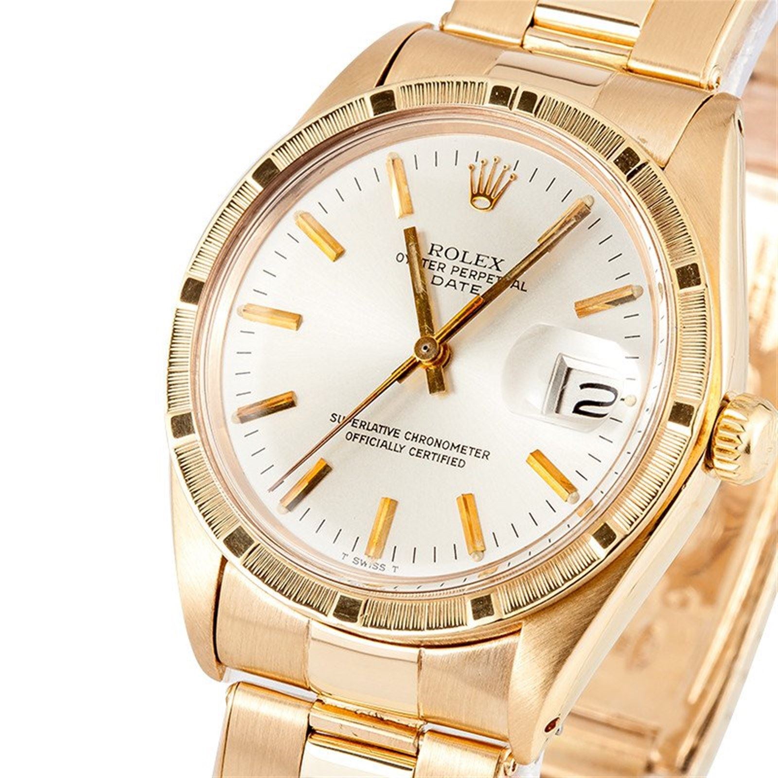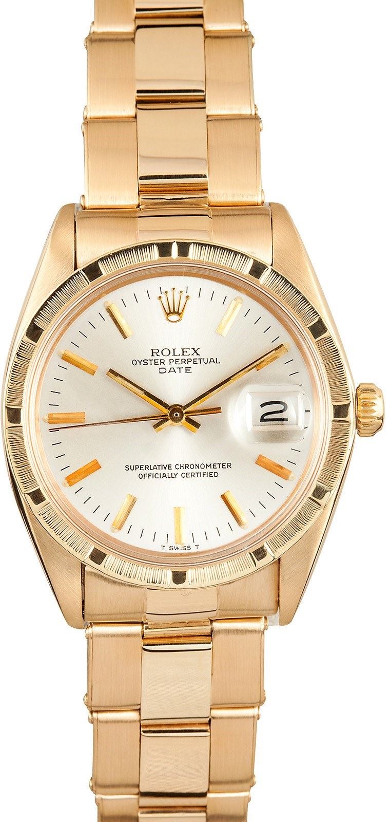 Model/Style-Date 1503 Serial/Year-Random Features-Automatic movement w/ date, waterproof screw-down crown, acrylic crystal Case-18k yellow gold w/ engine turned bezel (34mm) Bracelet-18K yellow gold Oyster Rivet (13 links) #9013