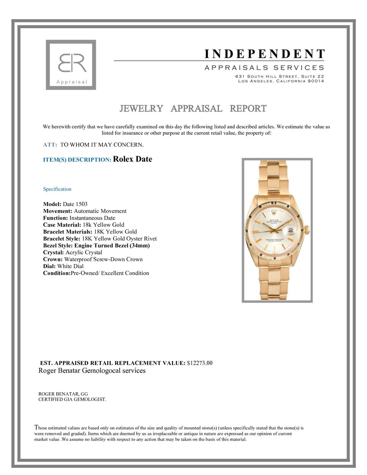 Not all jewelry, watches or loose stones are appraised and the appraisals are provided for bidders only in certain instances at the discretion of the Company. Appraisals, if any should be use to verify gemstone and or metal weights. The appraisals should not be used for valuation of any item. No guarantee, warranty or representation is intended by the Company in any appraisal. All dimensions and weights of such lots are approximate and are consistent with standards and practices in the industry. Condition reports are provided as a service to the prospective buyer. Bidders should take note that such descriptions are not warranties and that watches may need general service, change of battery or further repairs for which the buyer is solely responsible