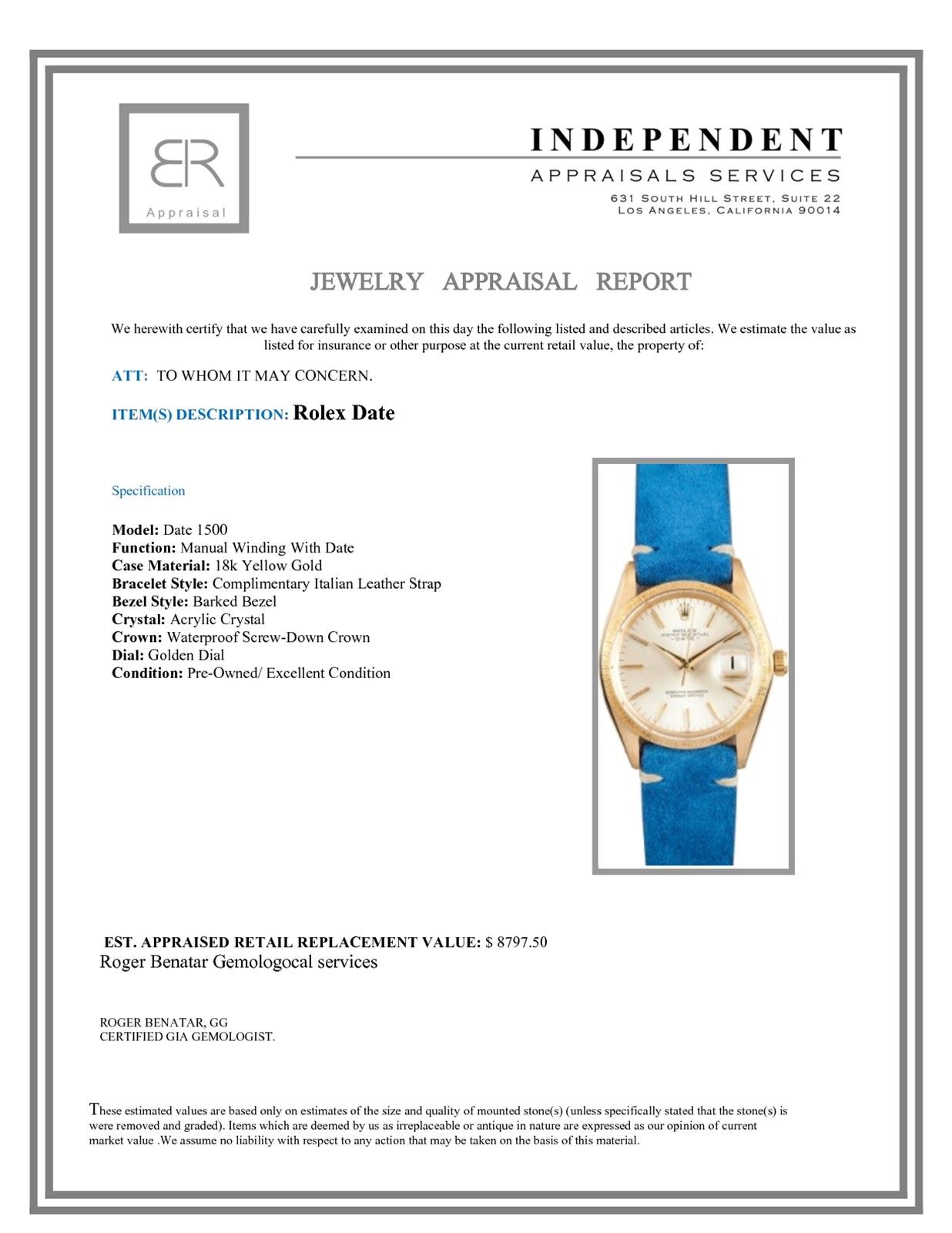 Model/Style-Date 1500 Serial/Year-Random Features-Manual winding with date, acrylic crystal, waterproof screw-down crown Case-18k Yellow Gold w/ barked bezel Bracelet-Complimentary Italian leather strap (other strap options available at no cost to customer) #9014