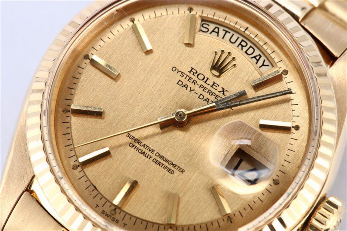 Model/Style-Day-Date (President) 1803 Serial/Year-Random Features-Automatic movement w/ day-date, acrylic crystal, waterproof screw-down crown Case-18K Yellow gold w/ fluted bezel (36mm) Bracelet-18K Yellow Gold Presidential #9067
