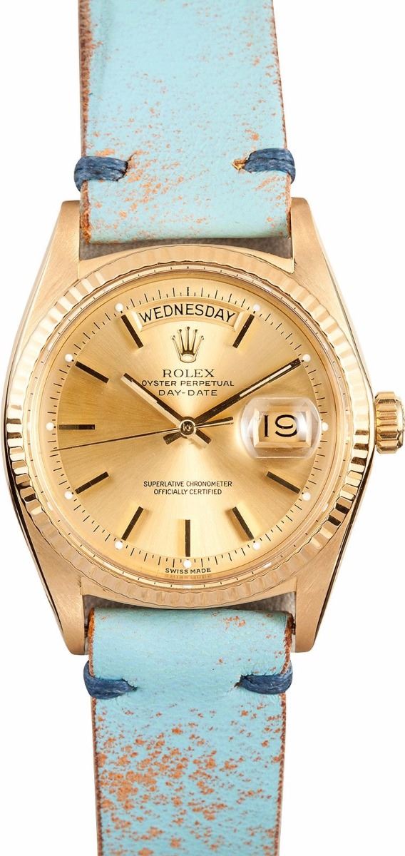 Model/Style-Day-Date (President) 1811 Serial/Year-Random Features-Automatic movement w/ day-date, acrylic crystal, waterproof screw-down crown Case-18k yellow gold w/ fluted bezel (36mm) Bracelet-Complimentary hand stitched leather strap (other strap options available at no cost to customer) #9066