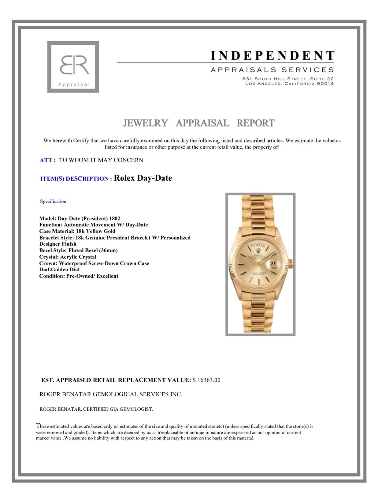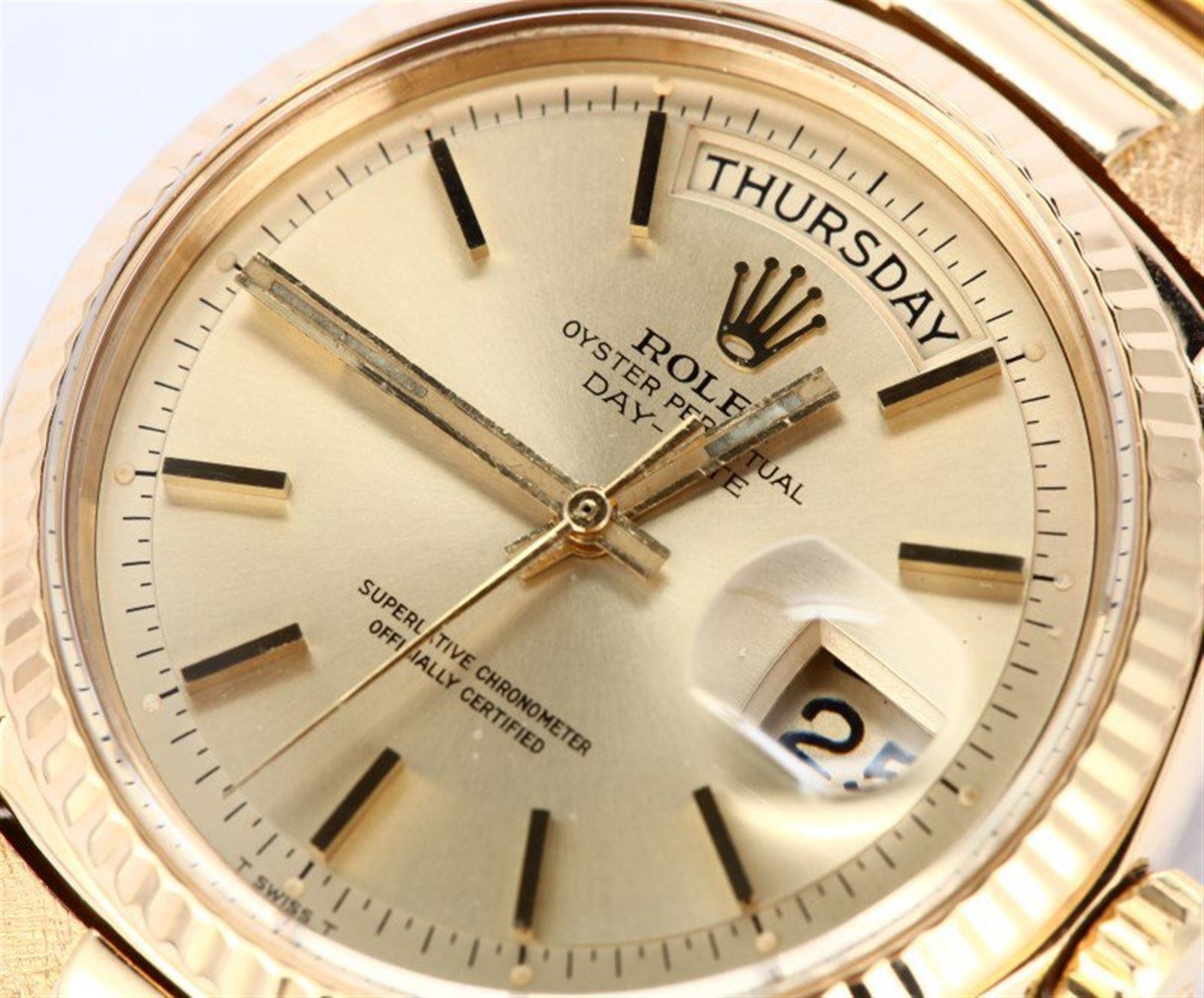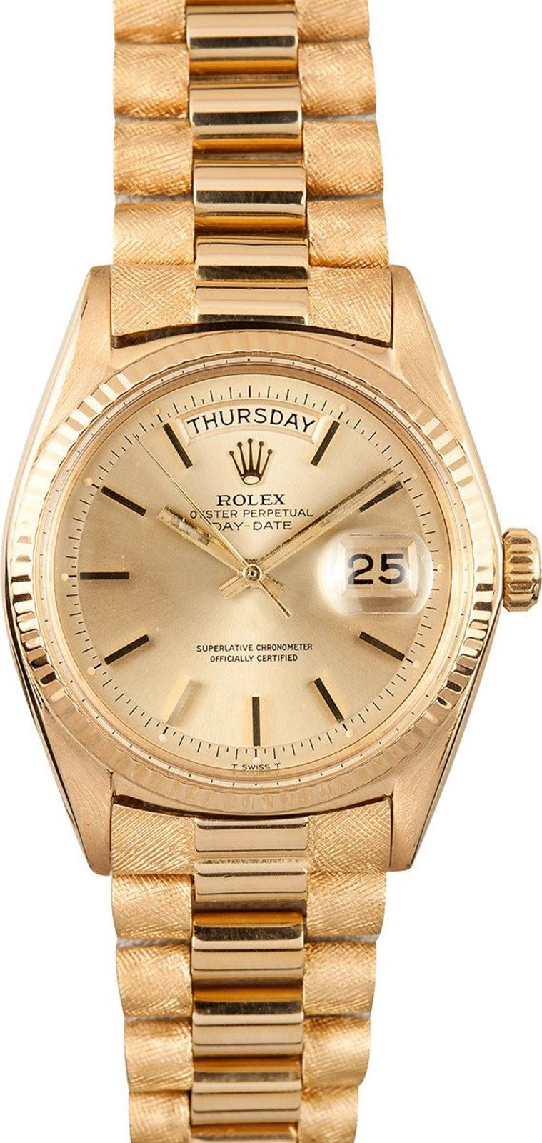 Model/Style-Day-Date (President) 1802 Serial/Year-Random Features-Automatic movement w/ day-date, acrylic crystal, waterproof screw-down crown Case-18K Yellow gold w/ fluted bezel (36mm) Bracelet-18K genuine president bracelet w/ personalized designer finish #9070