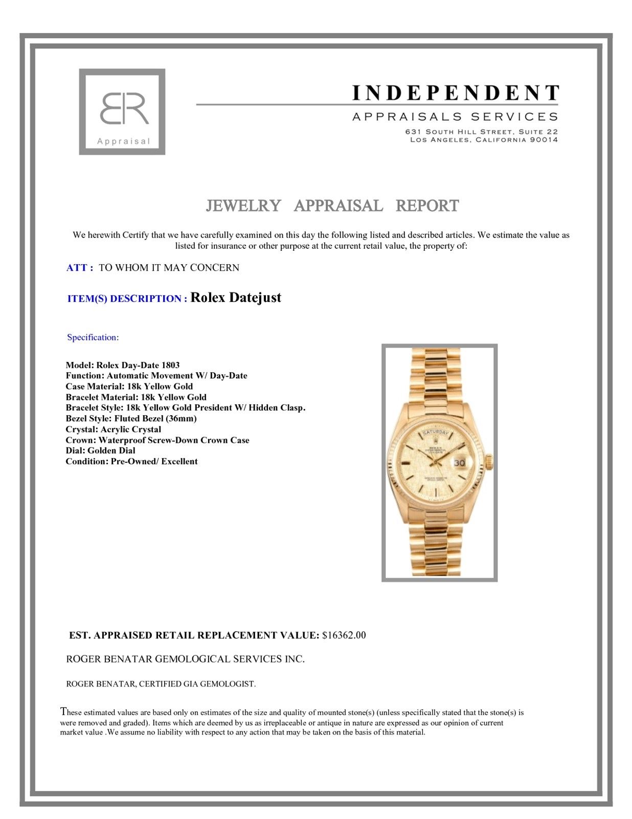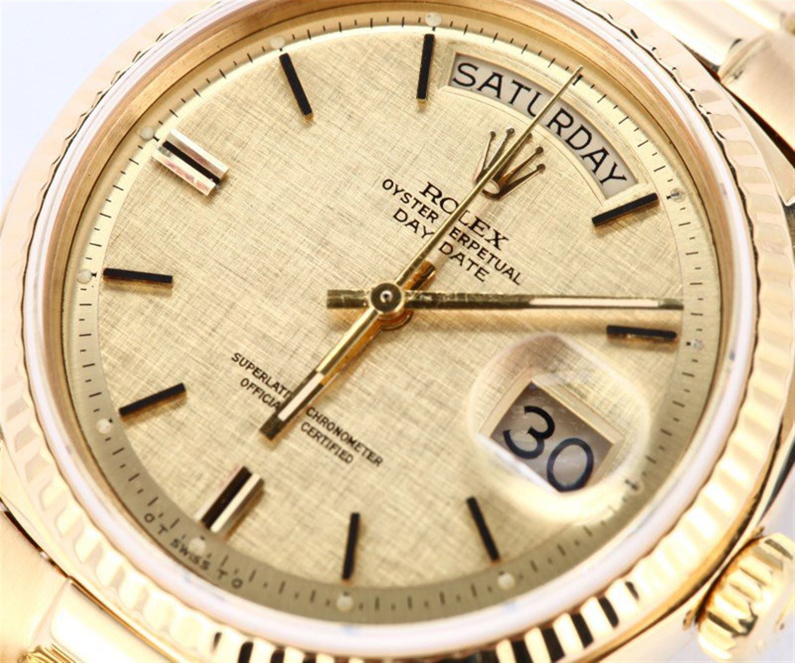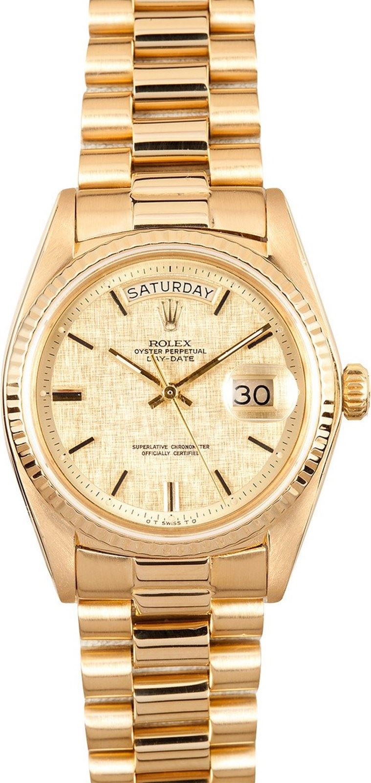 Model/Style-Day-Date 1803 Features-Automatic movement with day-date, waterproof screw-down crown, acrylic crystal Case-18k yellow gold w/ fluted bezel (36mm) Bracelet-18K yellow gold President w/ hidden clasp. Bracelet is in excellent condition with minimal stretch. #9068