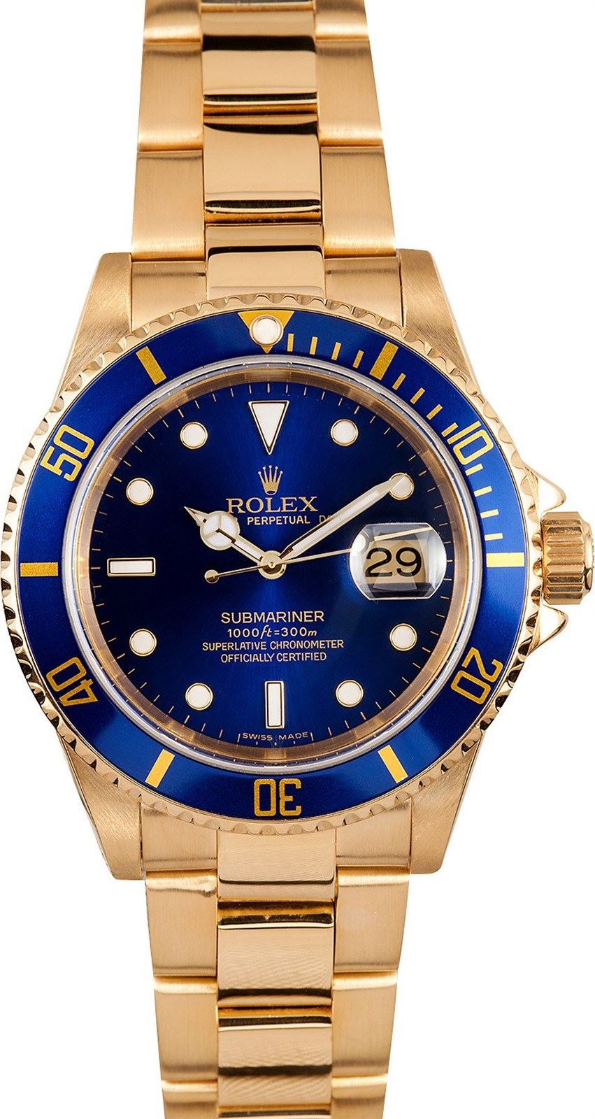 Model/Style-Submariner 16618 Serial/Year-Random Features-Automatic movement w/ date, waterproof screw-down crown, unidirectional rotatable diver's bezel, scratch-resistant sapphire crystal Case-18k yellow gold (40mm) w/ blue bezel insert Bracelet-18k yellow gold Oyster #9209