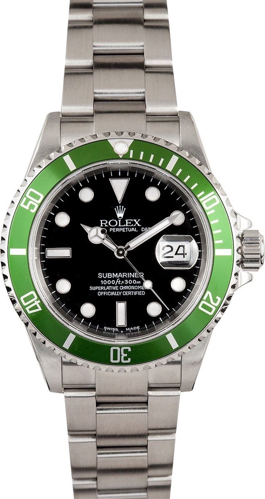 Model/Style-Submariner 16610V Serial/Year-Random Features-Automatic movement w/ date, waterproof screw-down crown, unidirectional rotatable diver's bezel, scratch-resistant sapphire crystal Case-Stainless steel w/ green bezel (40mm) Anniversary Edition (price adjustment for slight bezel scratch), no holes Bracelet-Stainless Steel Oyster #9216