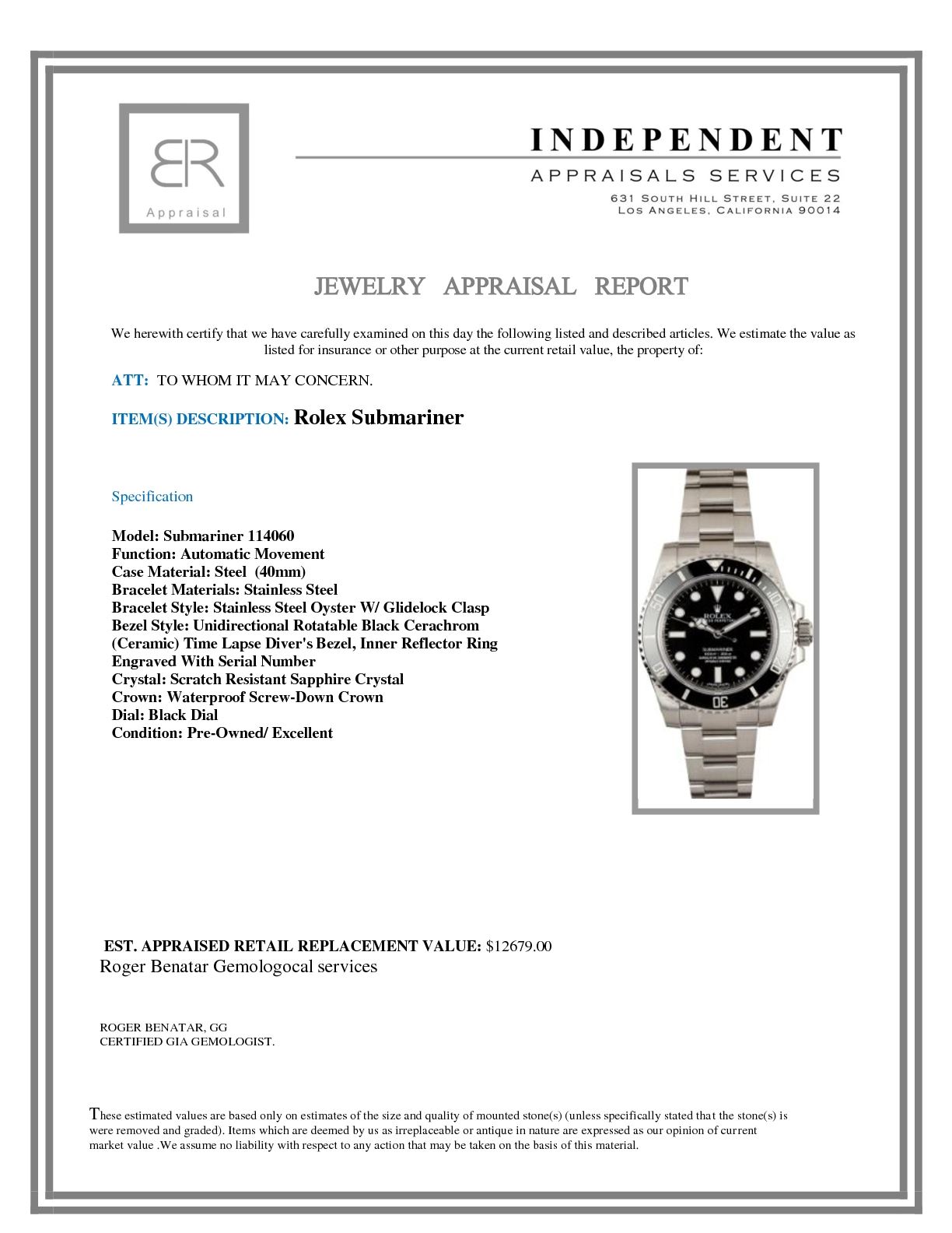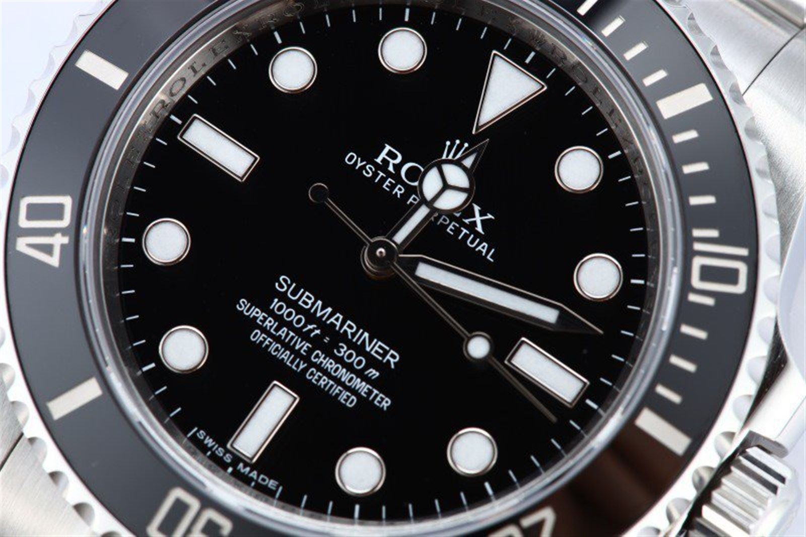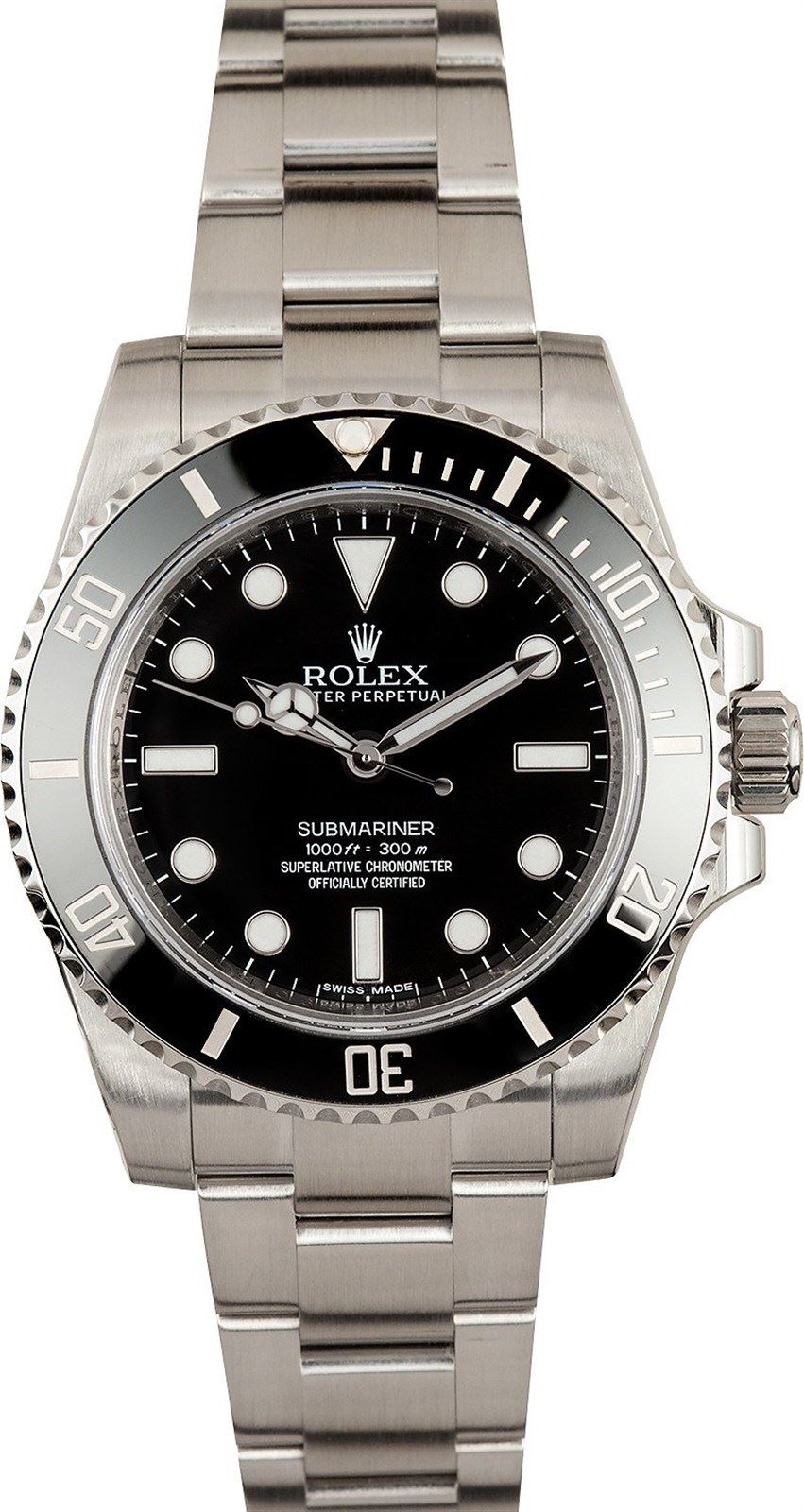 Model/Style-Submariner 114060 Serial/Year-Random Features-Automatic movement, waterproof screw-down crown, unidirectional rotatable black Cerachrom (ceramic) time lapse diver's bezel, scratch-resistant sapphire crystal Case-Stainless steel (40mm) no holes, inner reflector ring engraved w/ serial number Bracelet-Stainless steel Oyster w/ Glidelock clasp #9256