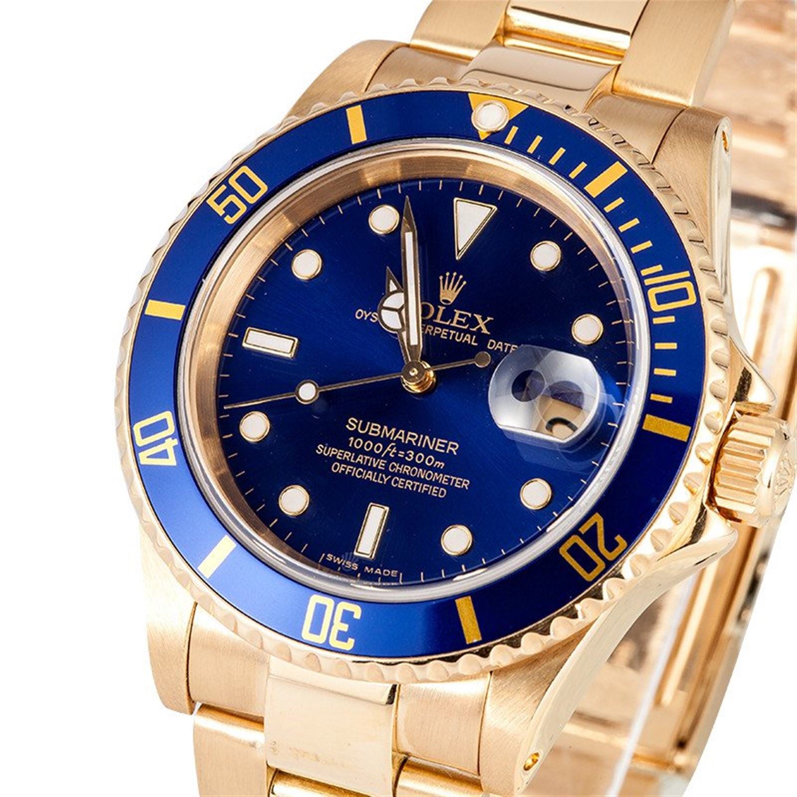 Model/Style-Submariner 16618 Serial/Year-Random Features-Automatic movement w/ date, waterproof screw-down crown, unidirectional rotatable diver's bezel, scratch-resistant sapphire crystal Case-18k yellow gold (40mm) w/ blue bezel insert Bracelet-18k yellow gold Oyster #9209