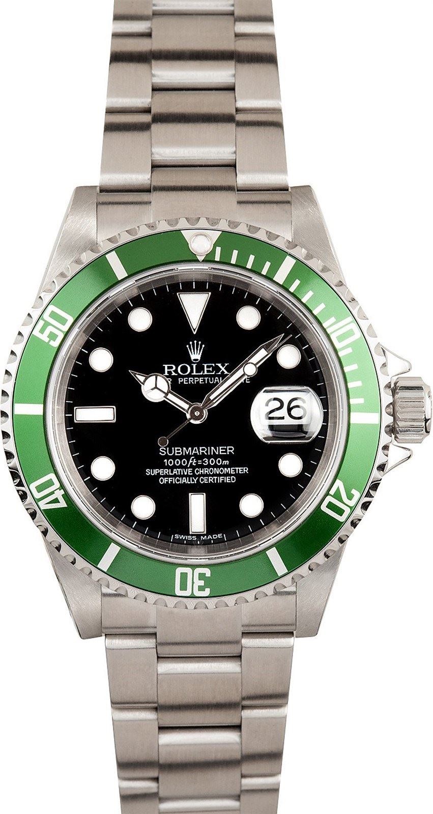 Model/Style-Submariner 16610V Serial/Year-Random Features-Automatic movement w/ date, waterproof screw-down crown, unidirectional rotatable diver's bezel, scratch-resistant sapphire crystal Case-Stainless steel w/ green bezel (40mm) Anniversary Edition, no holes Bracelet-Stainless Steel Oyster #9252