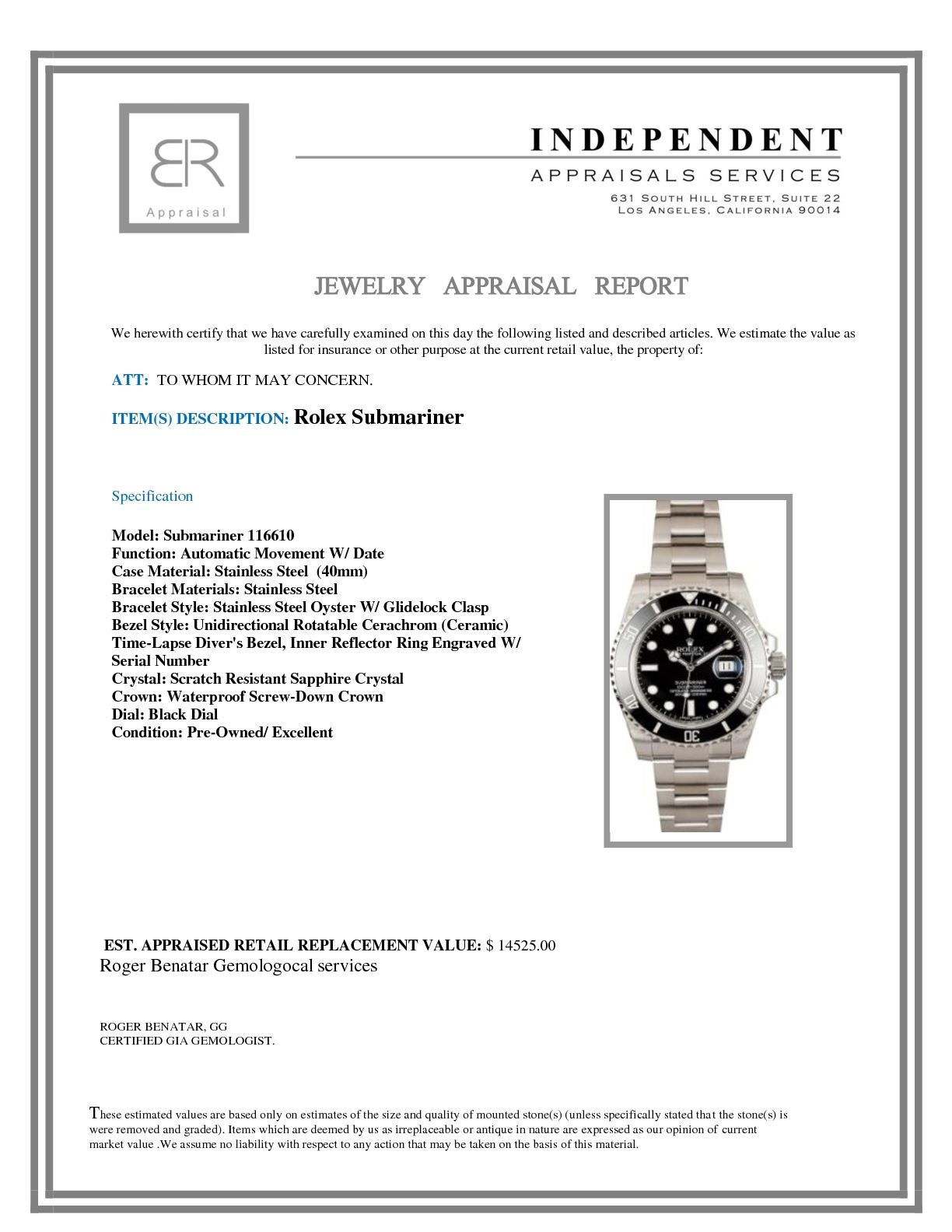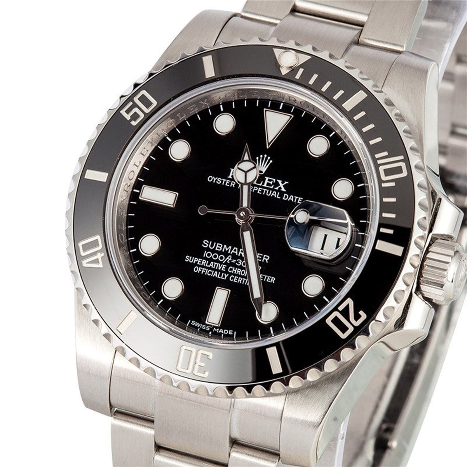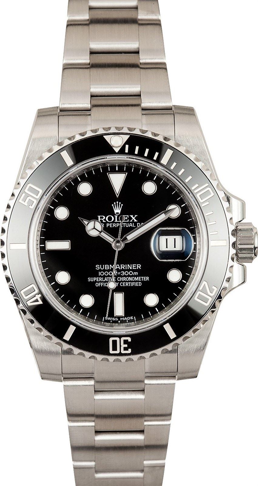 Model/Style-Submariner 116610 Features-Automatic movement, waterproof screw-down crown, unidirectional rotatable Cerachrom (ceramic) time-lapse diver's bezel, scratch-resistant sapphire crystal Case-Stainless steel (40mm), inner reflector ring engraved w/ serial number Bracelet-Stainless steel Oyster w/ Glidelock clasp #9240