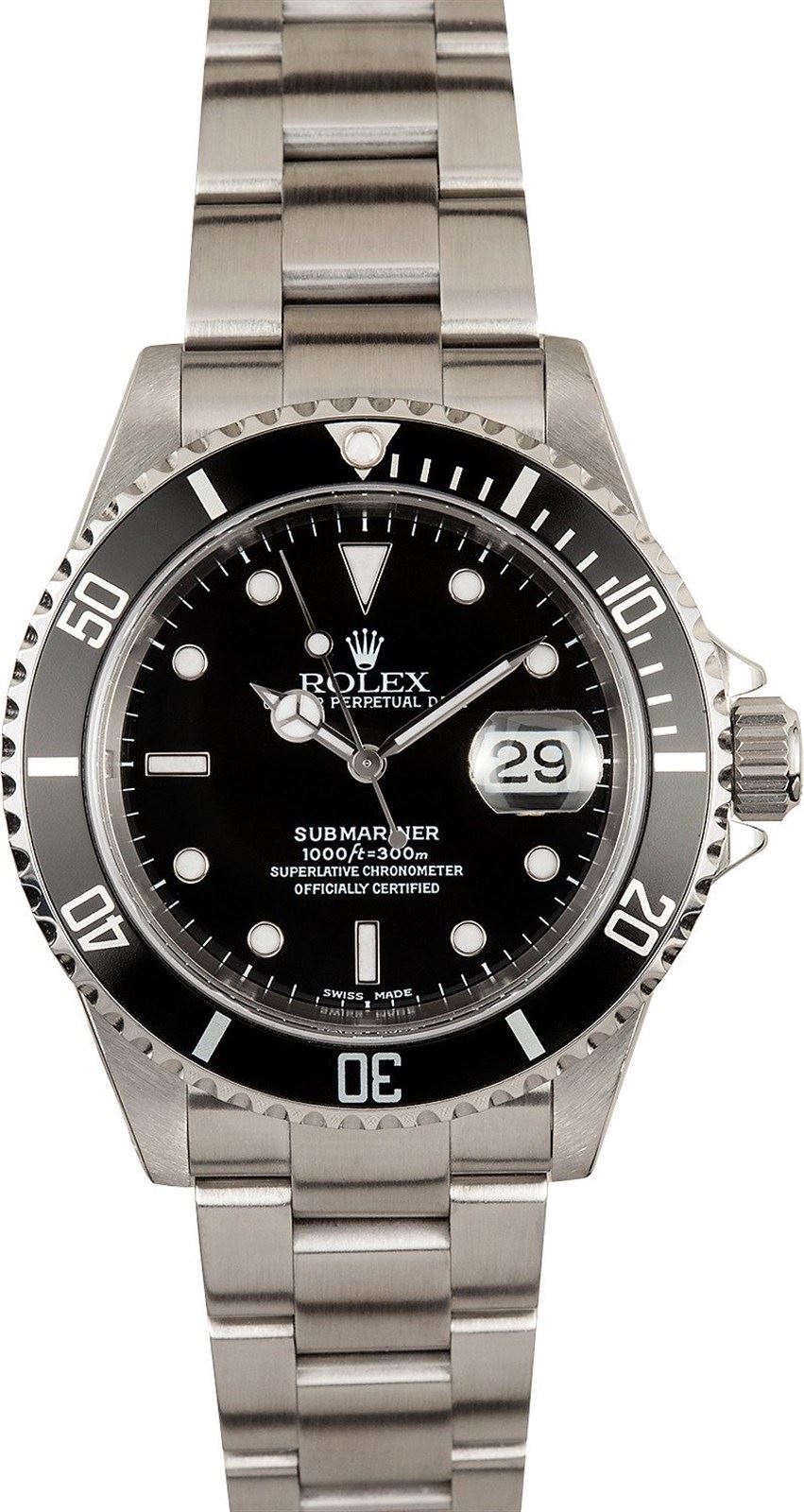 Model/Style-Submariner 16610 Features-Automatic movement, waterproof screw-down crown, unidirectional rotatable time-lapse diver's bezel, scratch-resistant sapphire crystal Case-Stainless steel (40mm) Bracelet-Stainless steel Oyster #9234