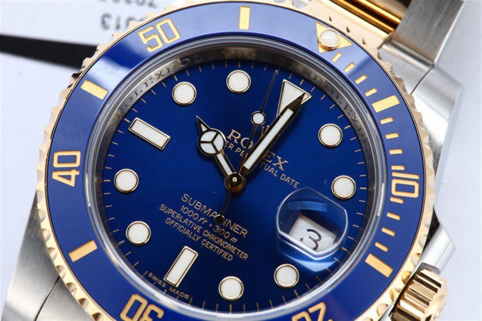 Model/Style-Submariner 116613 Features-Automatic movement w/ date, waterproof screw-down crown, scratch resistant sapphire crystal, rotatable diver's ceramic bezel, inner reflector ring engraved with serial number Case-18k gold & stainless steel (40mm) Bracelet-Blue w/ luminous hour markers #9246