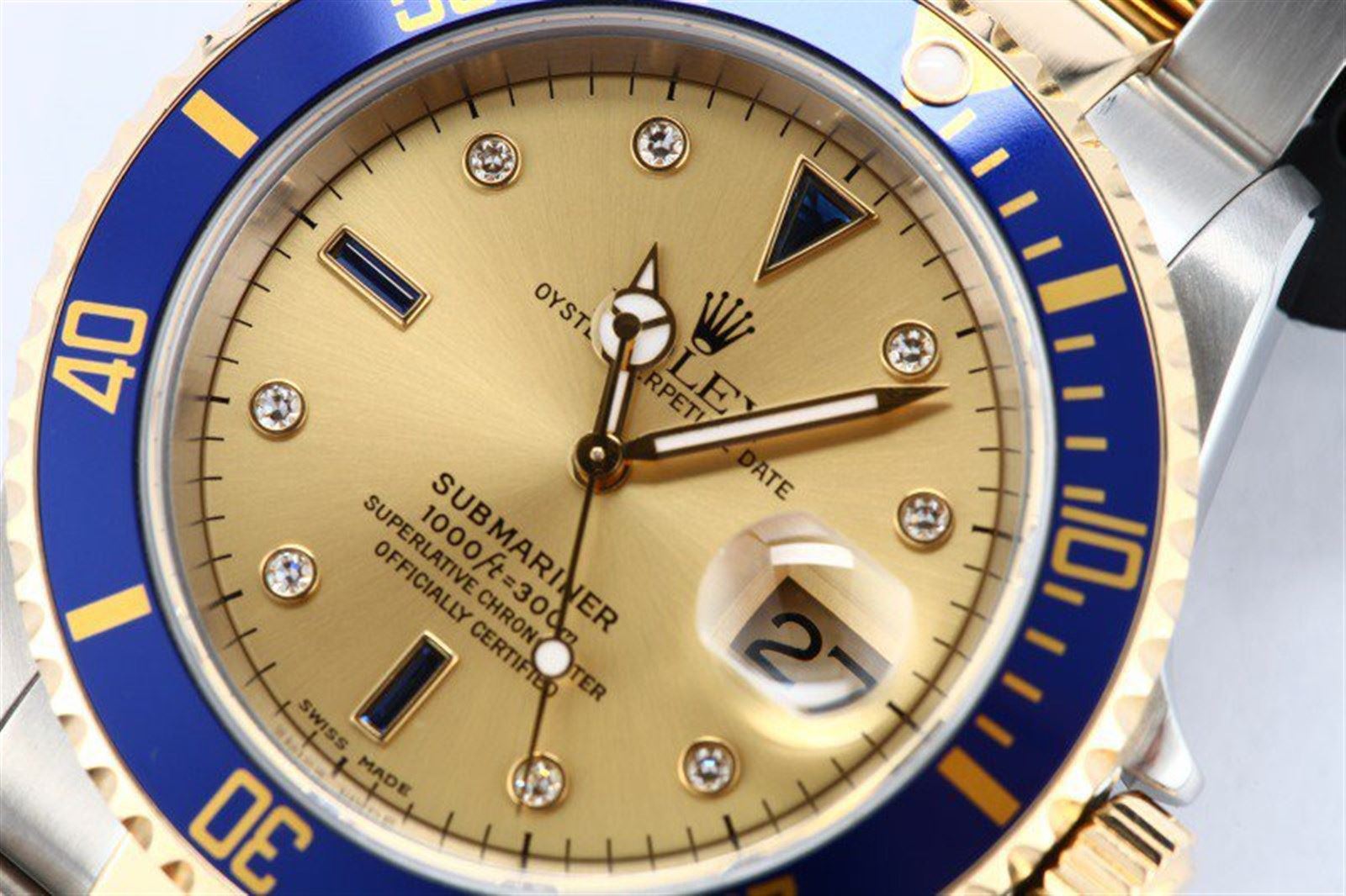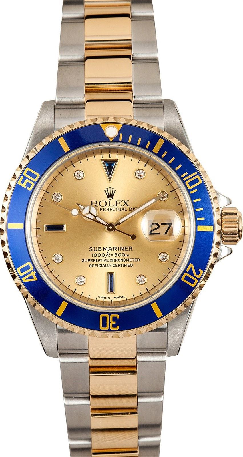 Model/Style-Submariner 16613 Features-Automatic movement w/date, waterproof screw down crown, unidirectional rotatable time-lapse diver's bezel, waterproof to 1,000 ft, scratch-resistant sapphire crystal Case-18k Gold & Stainless steel (40mm), no holes Bracelet-18k gold & stainless steel Oyster w/ gold thru clasp #9249