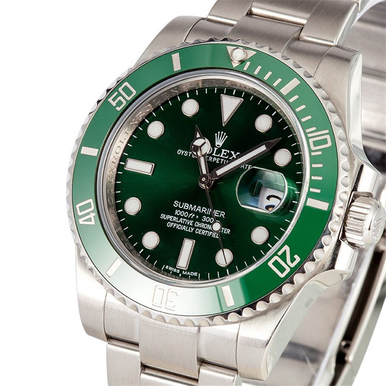 Model/Style-Submariner 116610LV Features-Automatic movement, waterproof, screw-down crown, green ceramic unidirectional rotatable time-lapse diver's bezel, scratch-resistant sapphire crystal Case-Stainless steel (40mm), inner reflector ring engraved w/ serial number Bracelet-Stainless Steel Oyster w/ Glidelock clasp #9201