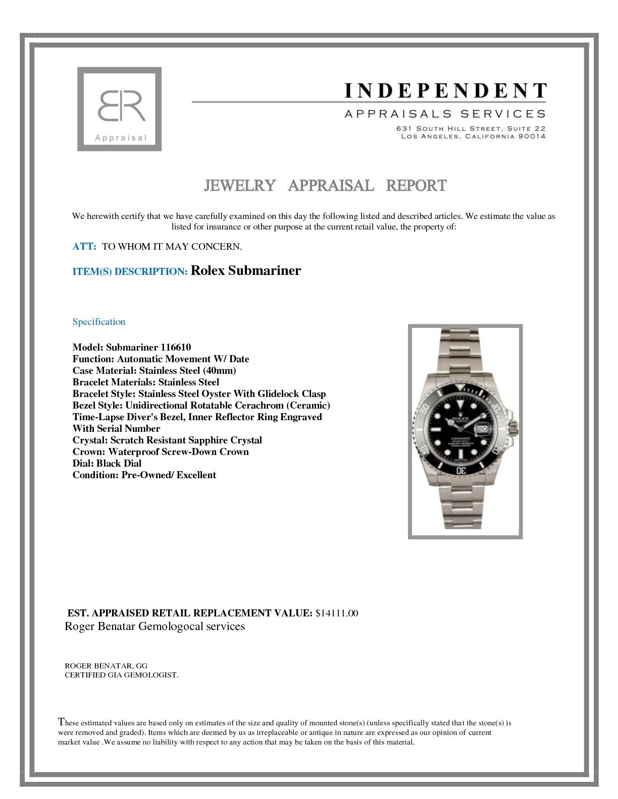 Model/Style-Submariner 116610 Features-Automatic movement w/ date, waterproof screw-down crown, unidirectional rotatable Cerachrom (ceramic) time-lapse diver's bezel, scratch-resistant sapphire crystal Case-Stainless steel (40mm), inner reflector ring engraved with serial number, no holes case Bracelet-Stainless steel Oyster with Glidelock clasp #9262