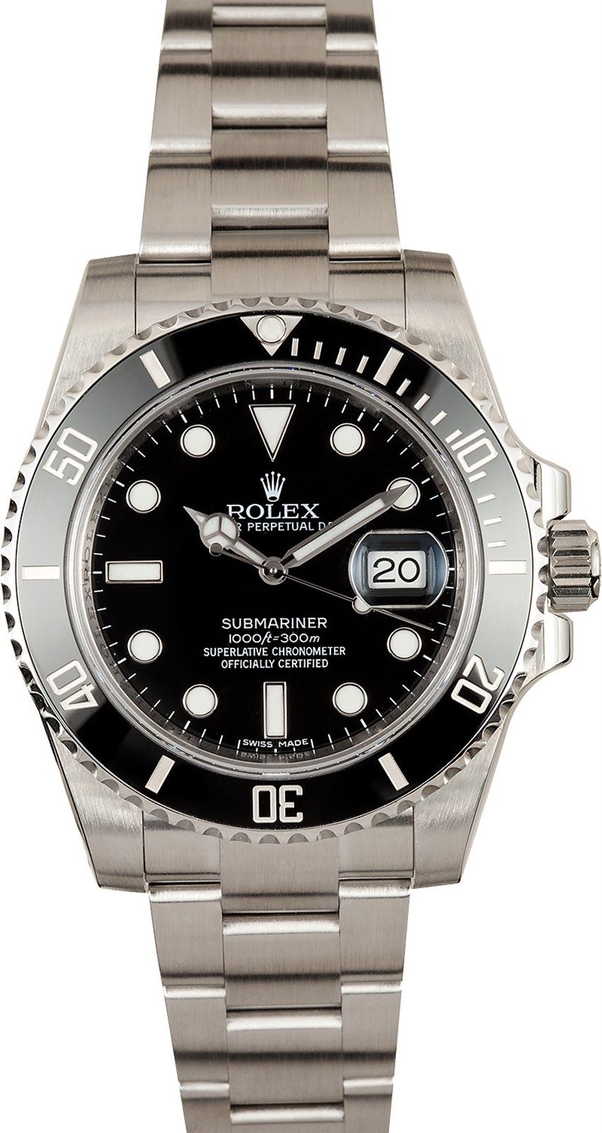 Model/Style-Submariner 116610 Features-Automatic movement w/ date, waterproof screw-down crown, unidirectional rotatable Cerachrom (ceramic) time-lapse diver's bezel, scratch-resistant sapphire crystal Case-Stainless steel (40mm), inner reflector ring engraved with serial number, no holes case Bracelet-Stainless steel Oyster with Glidelock clasp #9221