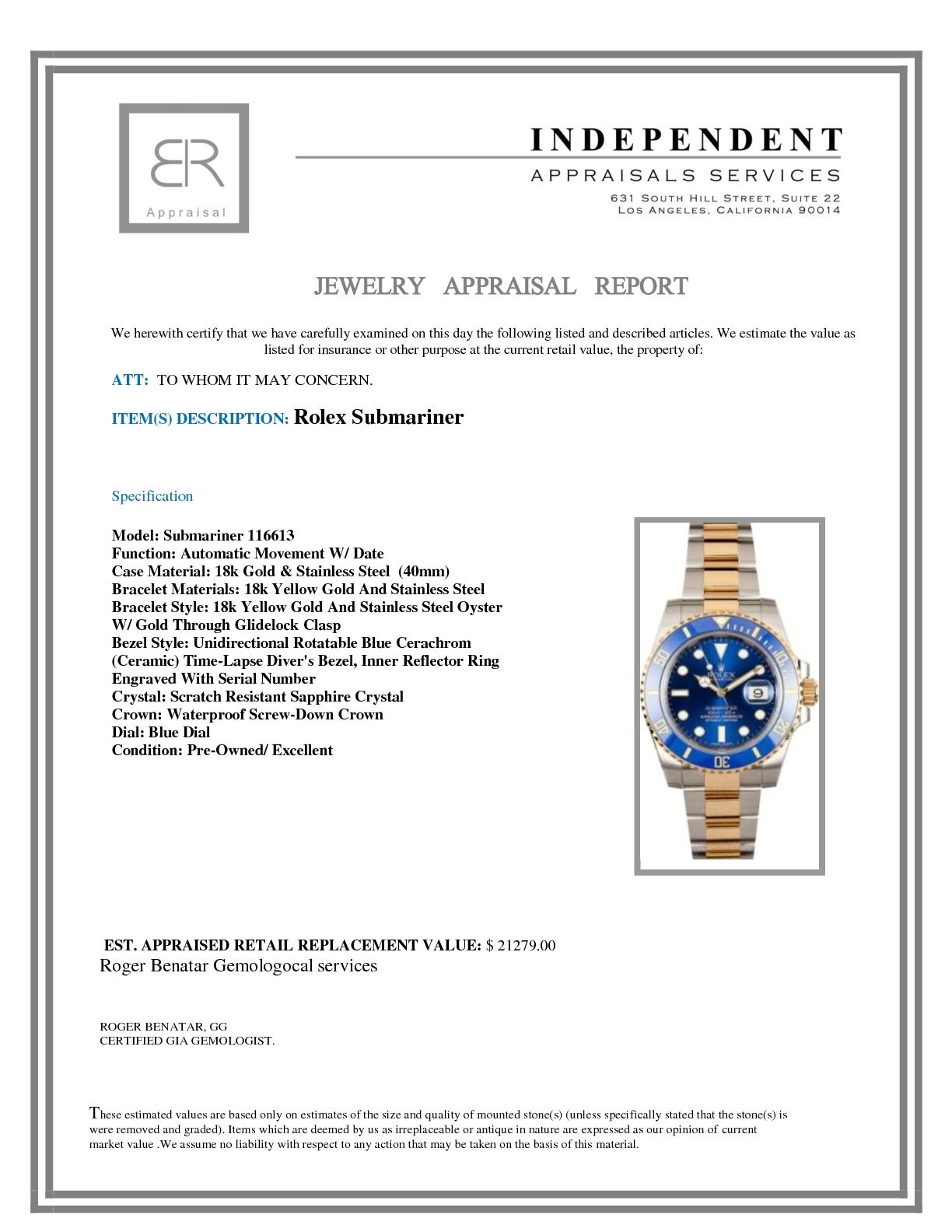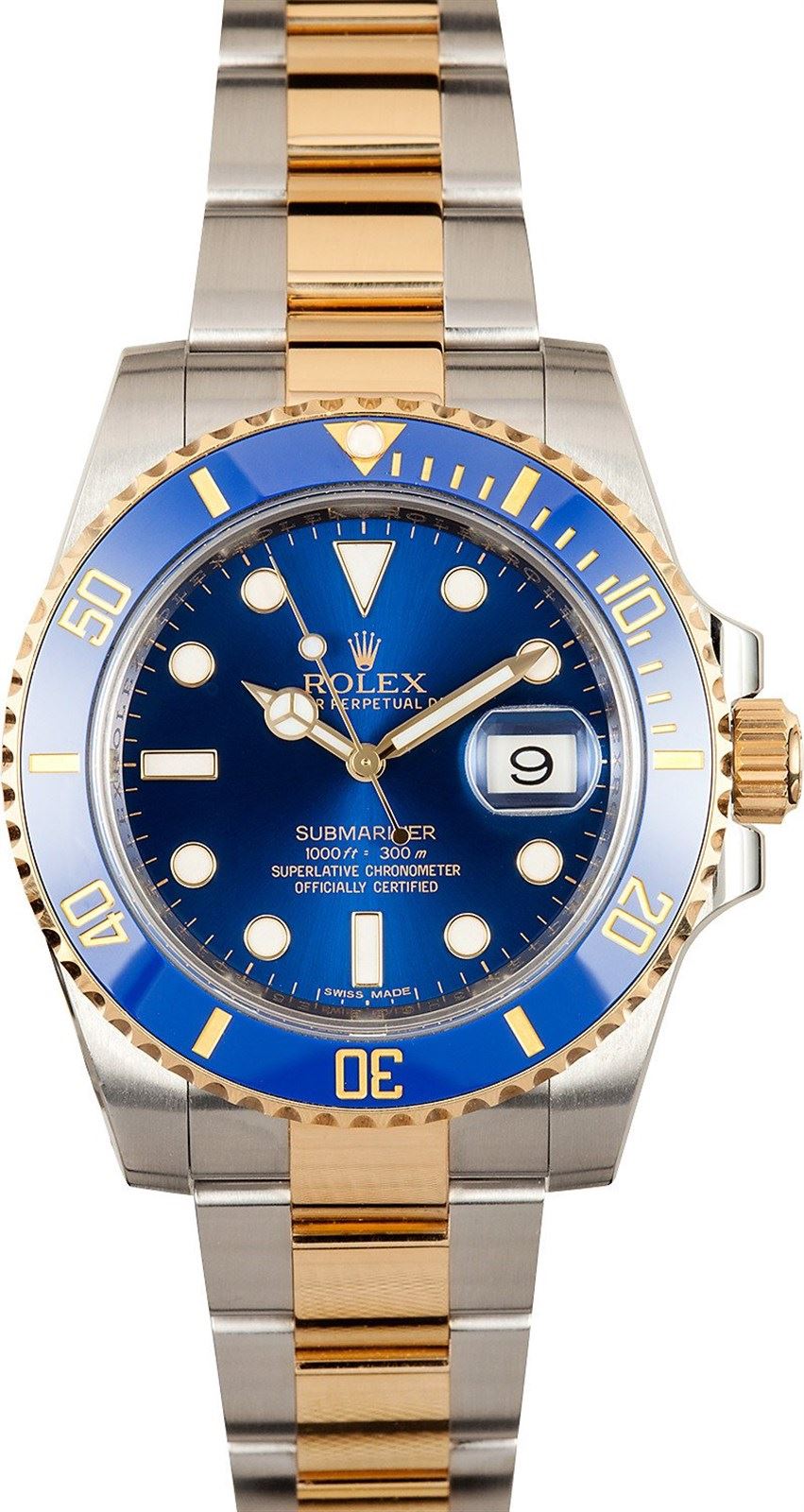 Model/Style-Submariner 116613 Features-Automatic movement w/ date, waterproof screw-down crown, unidirectional rotatable blue Cerachrom (ceramic) time-lapse diver's bezel, scratch-resistant sapphire crystal Case-18k yellow gold & stainless steel (40mm), inner reflector ring engraved w/ serial number Bracelet-18k yellow gold and stainless steel Oyster w/ gold thru Glidelock clasp #9211