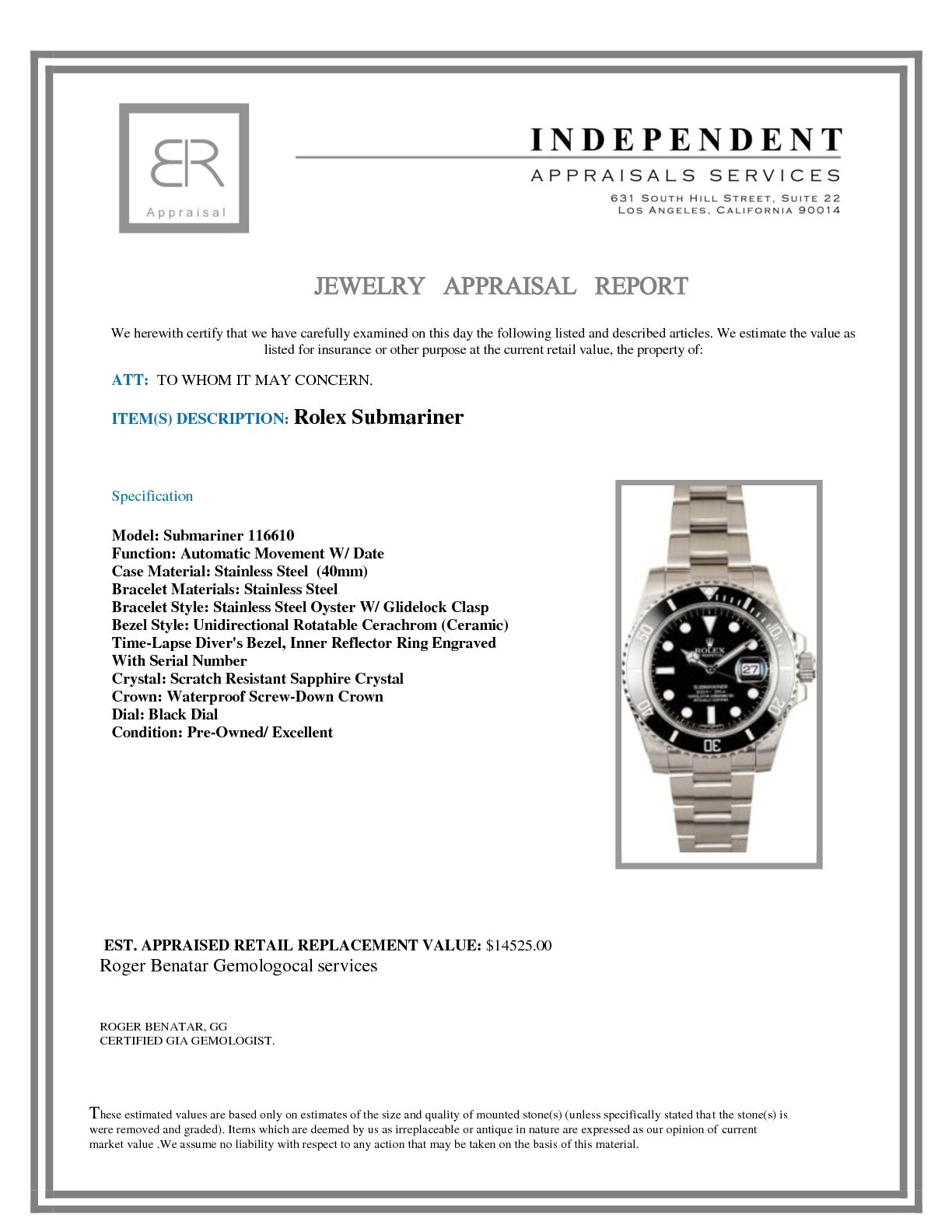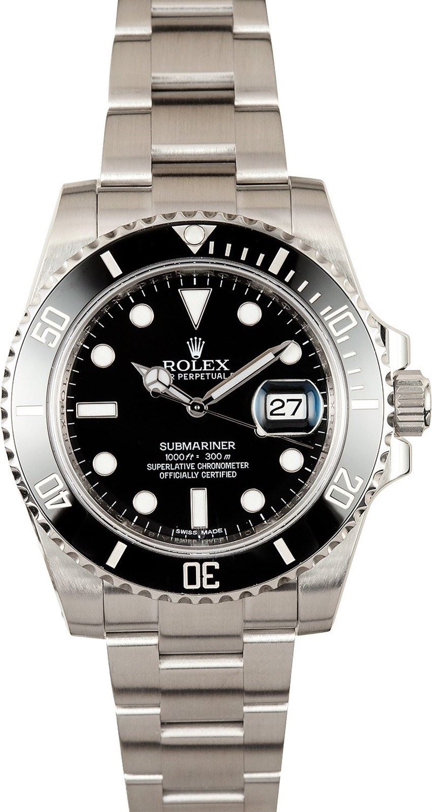 Model/Style-Submariner 116610 Features-Automatic movement, waterproof screw-down crown, unidirectional rotatable Cerachrom (ceramic) time-lapse diver's bezel, scratch-resistant sapphire crystal Case-Stainless steel (40mm), inner reflector ring engraved w/ serial number Bracelet-Stainless steel Oyster w/ Glidelock clasp #9238