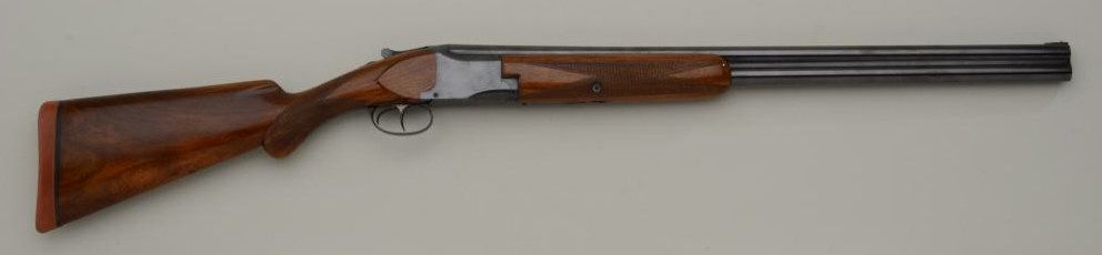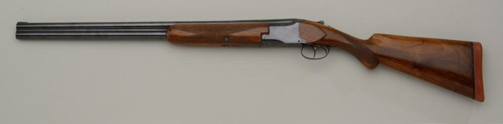 Pre-war Browning superposed 12 gauge over and under shotgun with factory 26 inch barrels, double triggers, auto-ejector’s, matted top barrel with no rib, one piece forend, long Tang with early rounded pistol grip and early prewar features made about 1935 serial number 6747. The gun shows approximately 85% to 95% original bright blue with just some slight losses at the front bottom of frame and gripping areas. The stocks are very goodplus with some light crazing to the original finish and about 90% varnish with good sharp checkering and just minor crazing. The stock measures 14 and three-quarter inches to the end of the wood and 15 and a quarter to theend of an added hard rubber recoil pad. The interior condition is fine to excellent and shows just a slight amount of use. Choked improved cylinder over improved cylinder. Stock showing a 3 inch drop of the heel andone and three-quarter inch drop of the comb. Made for 2 and three-quarter inch shells. Est. $1000 -$2000