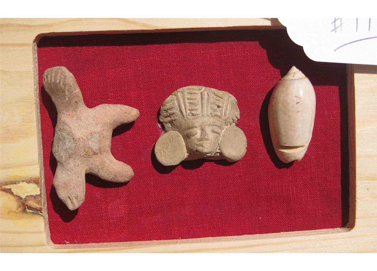 Group of framed mayan artifacts to include ceramic bird, clam bead and shell pendant. Circa 1000 AD. shipping 15.00. Fine condition