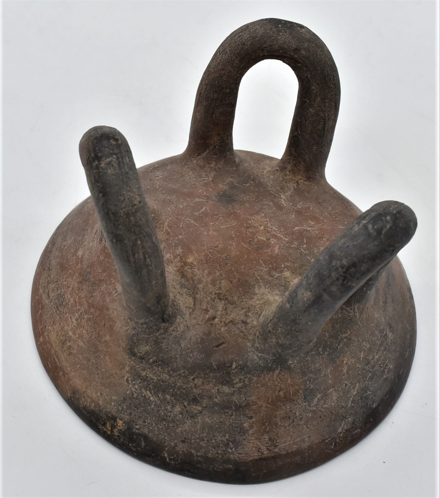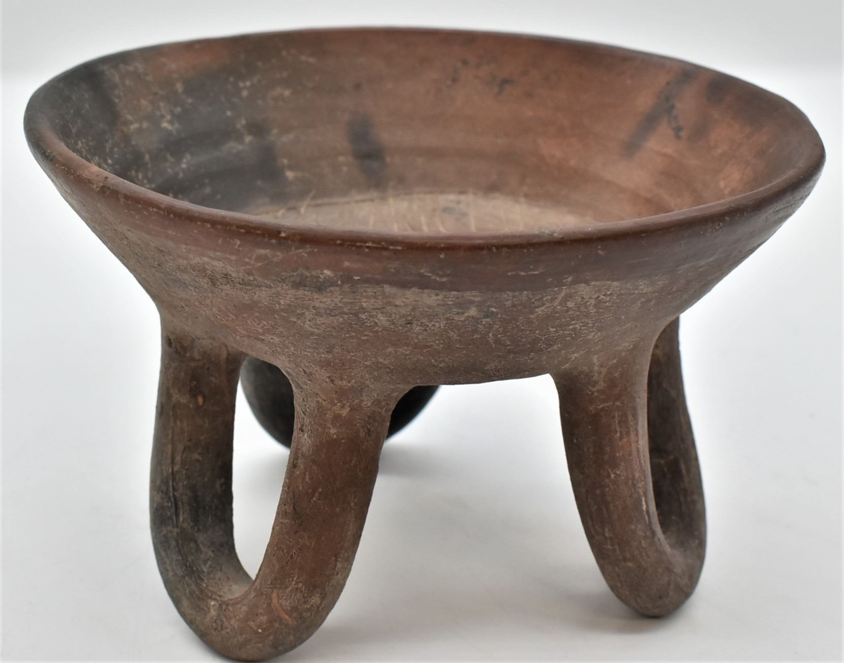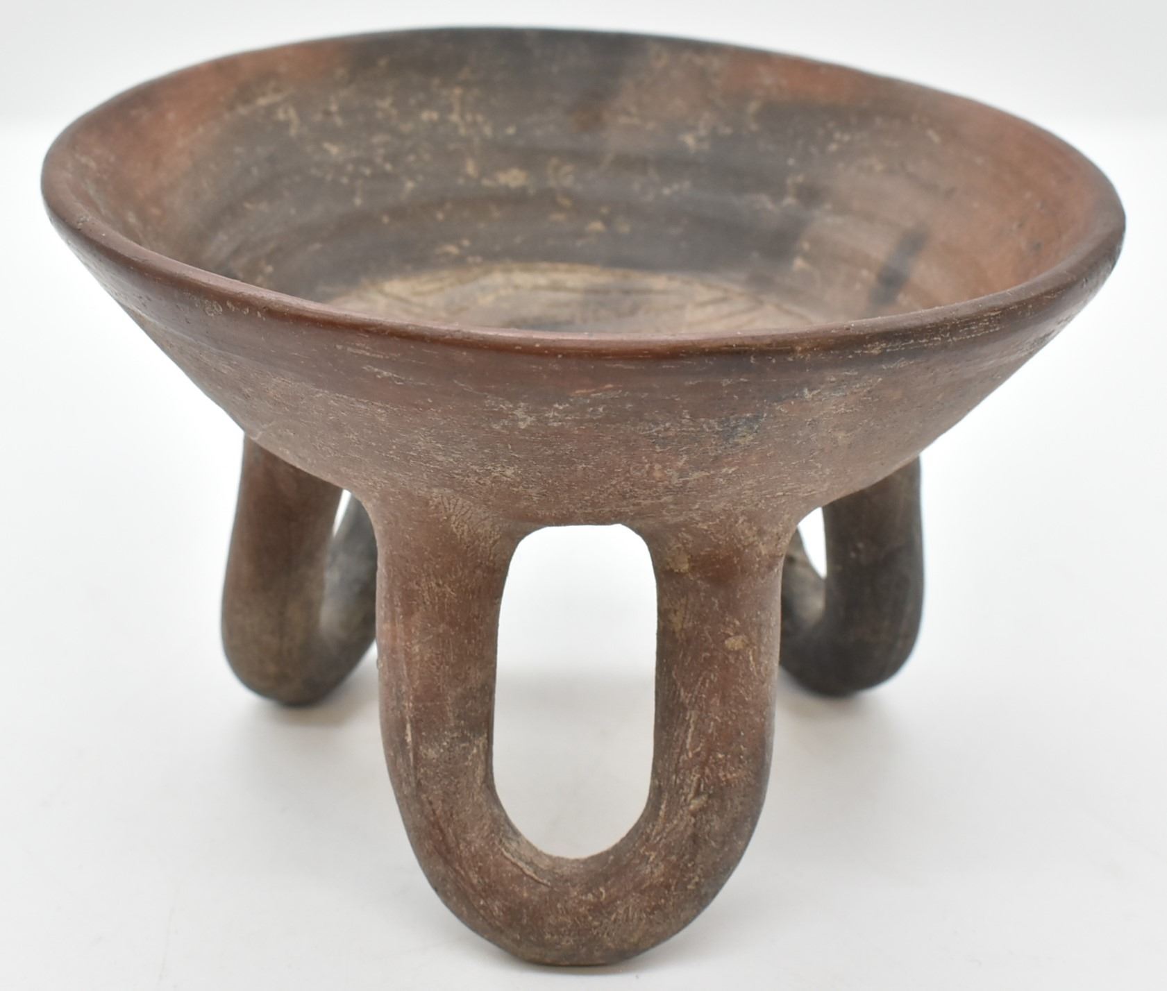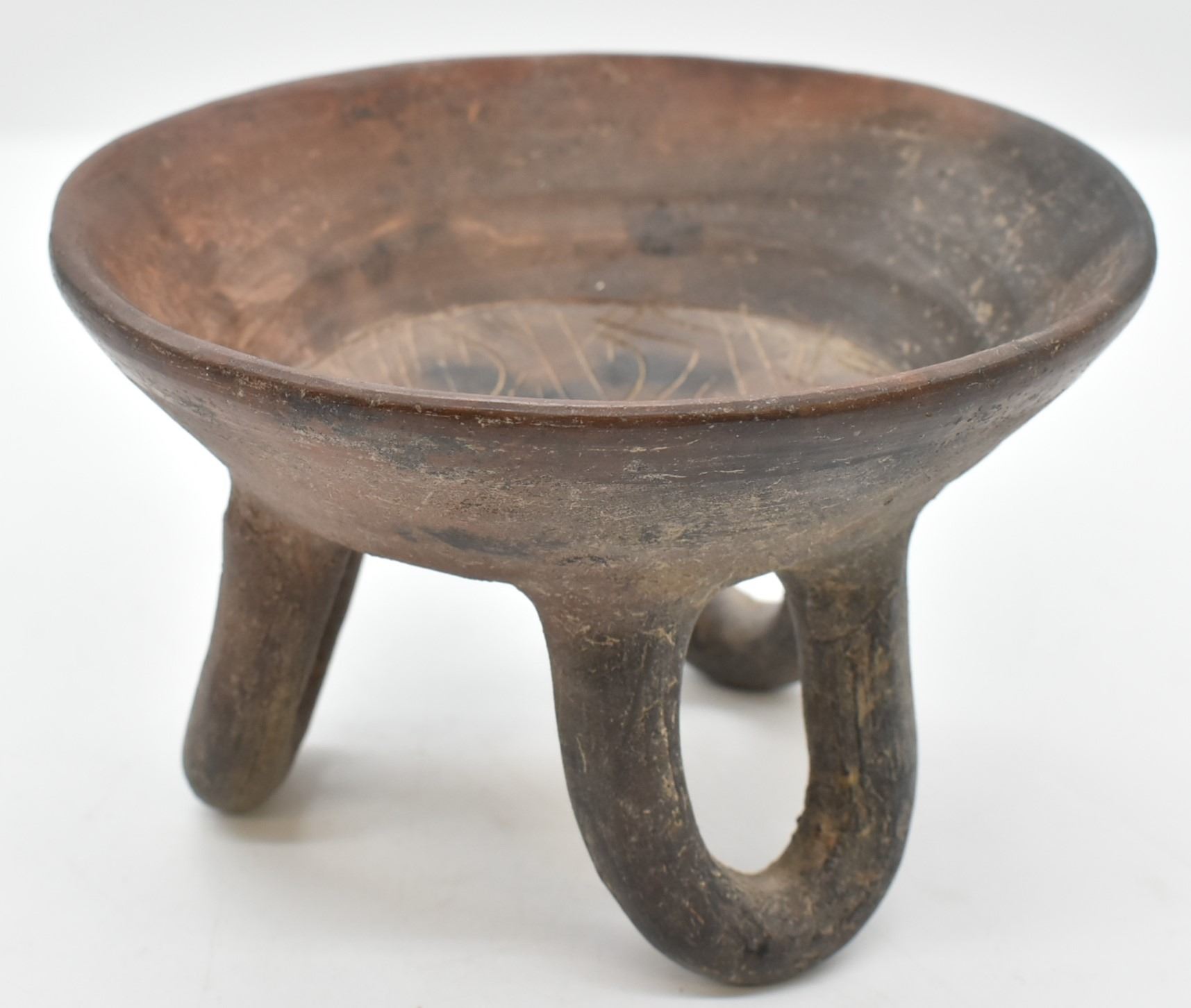 PreColumbian Costa Rican Pottery Bowl, tripod bowl with loop form legs, etched designs inside of bowl resembling possibly water or wind, measures 6''D x 3.5''H, FYI: ''Vessels like this example are known as chocolate pots since scholars believe the ancients drank the sacred cacao drink - similar to modern day hot chocolate - from them.''