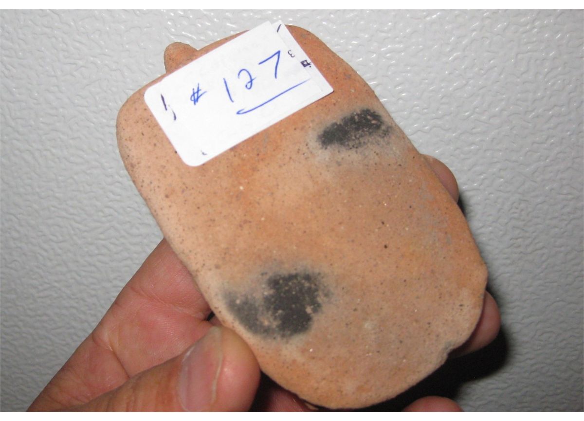 Prisoner figure tied to a bed. Ceramic from Jalisco, Mexico 3x4x1 inches, circa 700 AD, Good condition with some slip loss
