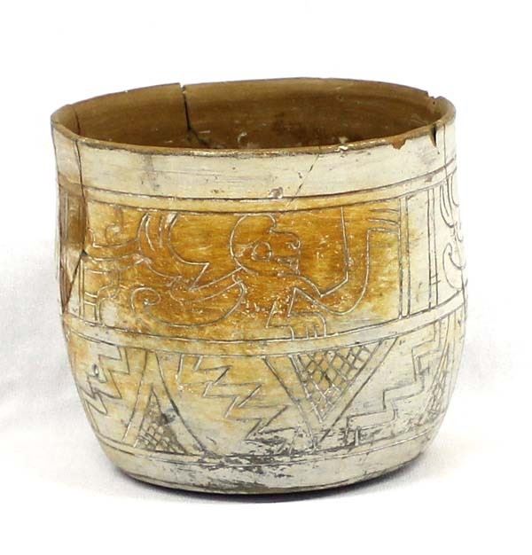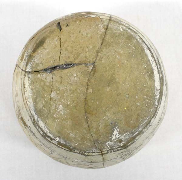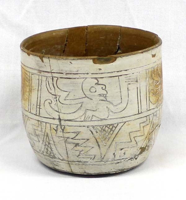 PreColumbian Mayan Style Pottery Jar, measures 4'' x 4.5'' and has been glued, age and origin unknown, features incised monkeys