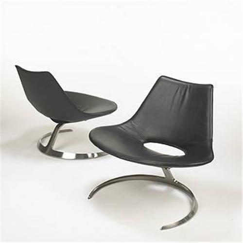 Preben Fabricius and Jorgen Kastholm<BR>Scimitar chairs, pair<BR>Ivan Schlechter<BR>Denmark, 1962<BR>stainless steel, leather<BR>32.5"w x 27"d x 25"h<BR>This design takes its name and shape from the Turkish sword. Manufacturer's label to underside.<BR>Literature: Danish Chairs, Oda, pg. 196<BR><BR><BR><BR>
