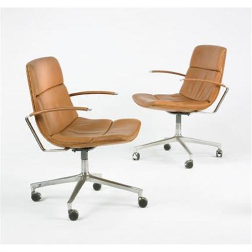 27 w x 24 d x 33.75 h inches<BR><BR>Condition: Abrasions to edges and high points with numerous scratches and areas of dryness to original leather. Wear to metal bases from age and use. Overall fine vintage condition.