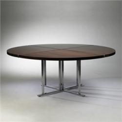 Preben Fabricius and Jorgen Kastholm dining table Alfred Kill Germany/Denmark, 1960s rosewood, stainless steel 71"dia x 28.25"h This table was done as a special order different from the two other known examples, which were oval. This is the only known example of this table.