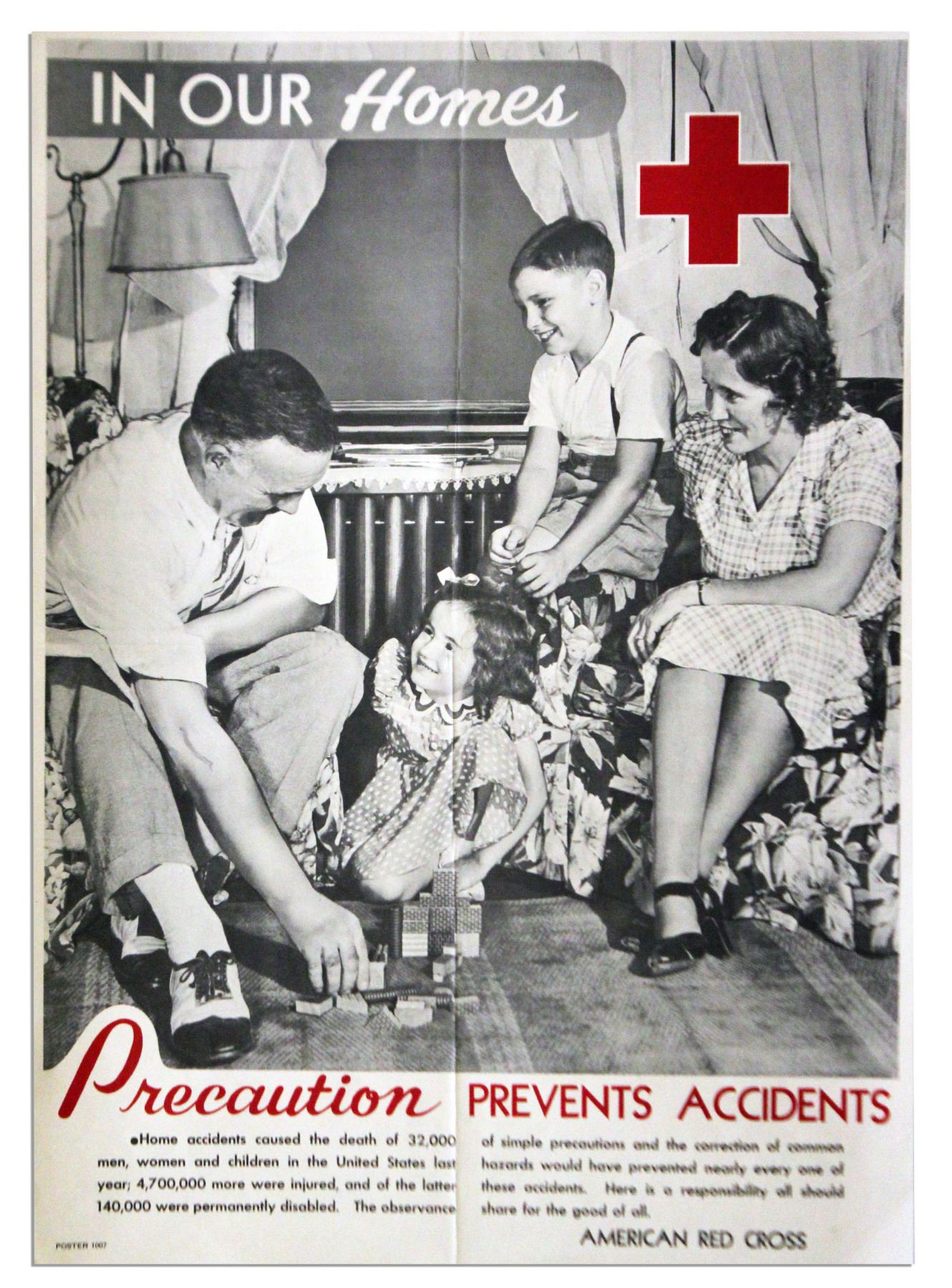 Vintage poster for the American Red Cross, showing a 1940's family enjoying time together. Smaller type at bottom reads ''Precaution Prevents Accidents / Home accidents caused the death of 32,000 men, women, and children in the United States last year; 4,700,000 more were injured, and of the latter 140,000 were permanently disabled...simple precautions...would have prevented nearly every one of these accidents...'' Print to the lower left identifies this as ''Poster 1007''. Measures 13.5'' x 19''. Toning and creasing, else near fine.