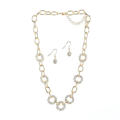 Precious Links Jewelry Set **|**|** Golden links and dazzling crystalline gems link together in a flurry of style to create this luxe necklace. This beautiful jewelry set features matching drop earrings inset with sparkling stones. Item weight: 0.1 lb. Necklace: 18-3/4 long, extended to 22" long; each earring is -3/8" x 1-1/4" long. Iron, zinc alloy and glass."