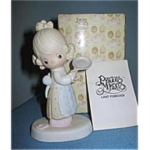 This Precious Moments Figurine Eggs Over Easy is marked Jonathan & David-1979 on the box. You can see the picture of the #E-3118 marked on the bottom. It's in the original box with the booklet and is in very good condition. It has been displayed through the years but there are no chips or cracks. It measures 5 3/4 inches tall and has the hour glass mark. An addition to any Precious Moments Collection. <BR>SH & Ins. will be quoted after orders placed. If you have questions please contact me and thank you for looking.