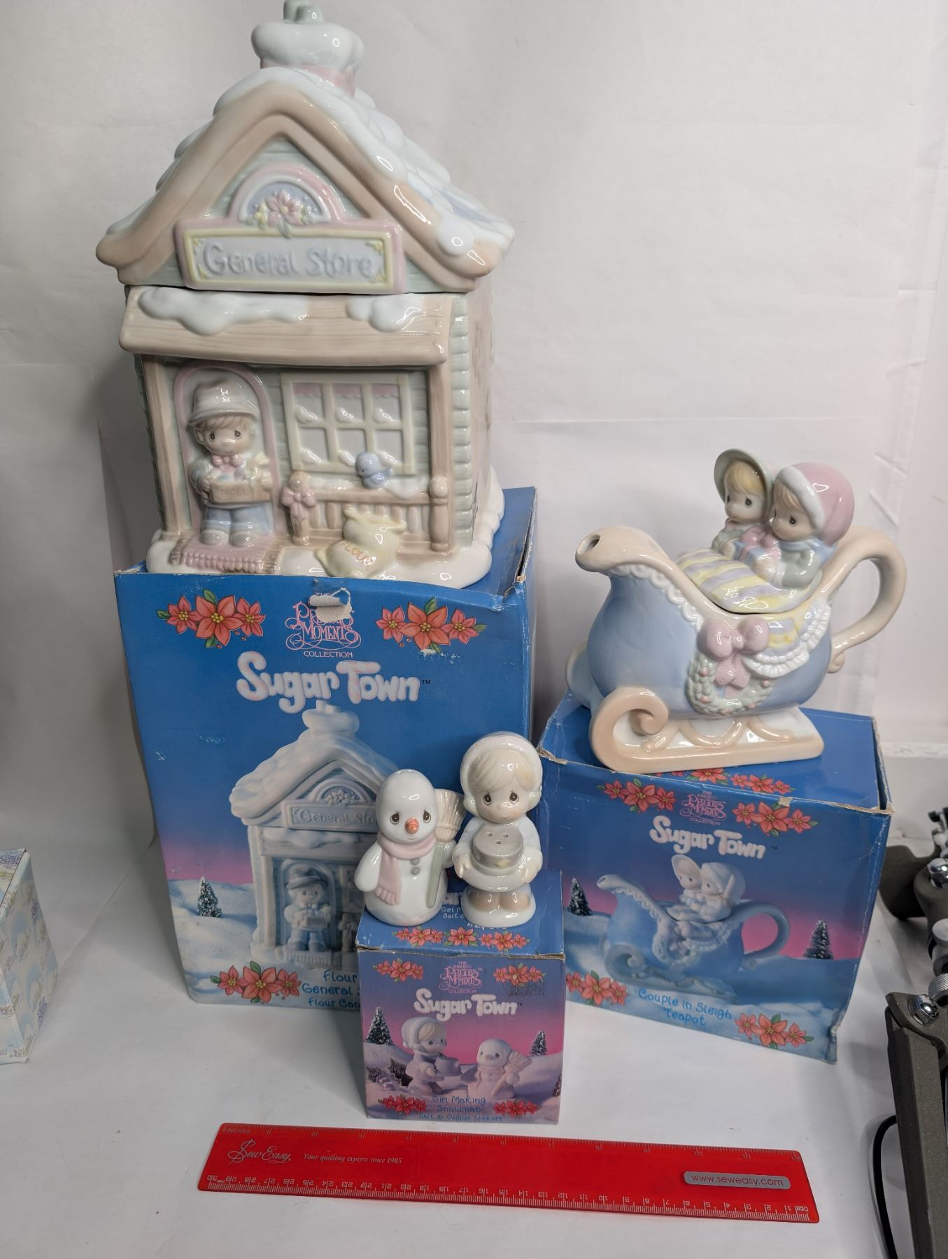 Precious Moments Flour Canister Snowman Salt and Pepper and Teapot
