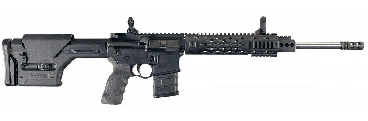 Bird cage flash supressor, stainless steel Lilja barrel with a aluminum semi-quad rail free floating handguard and a flat top receiver. Two flip up folding battle sights with a Magpul synthetic PRS adjustable buttstock. Standard features and markings of the model. Complete with a nylon soft rifle case with four magazine pouches