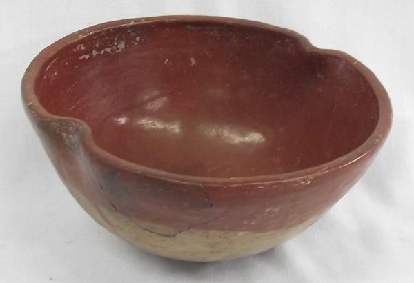 Precolumbian Pinched Handle Two Toned Bowl, measures 4.5''H x 9.5''W x 8 1/4''H. Red Glazed Bowl inside and upper outside. Rest of bowl is burnished natural clay bowl. As is, no restoration, or overpaint