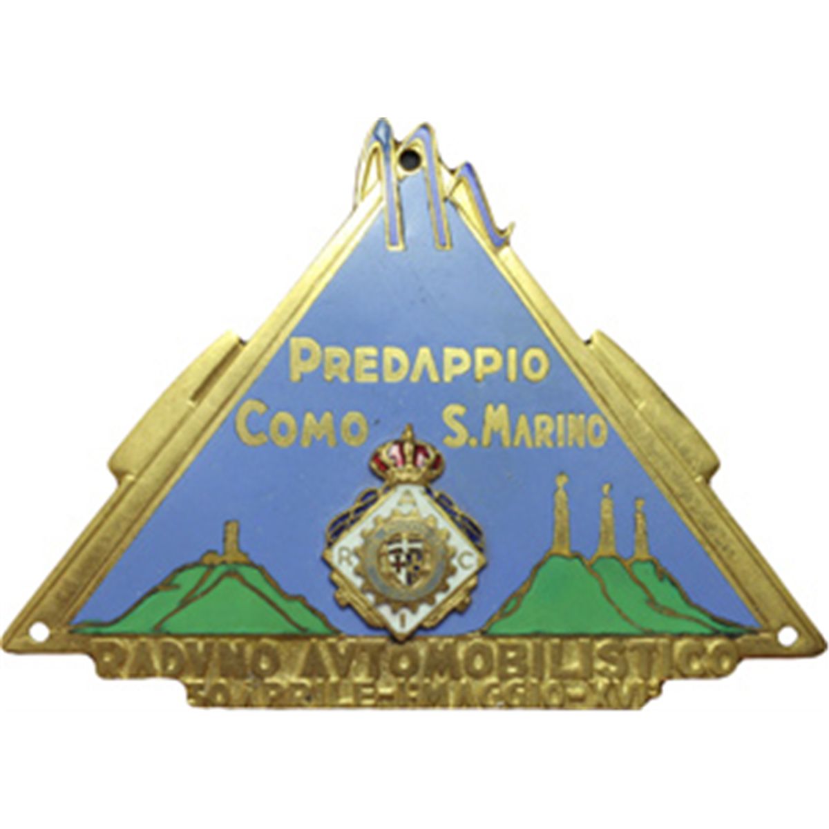 Medaglie e decorazioni fasciste. Predappio. Raduno automobilistico Predappio-Como-San Marino. Placchetta 30 aprile-1 maggio A.XVI, di forma triangolare,98x74 mm, con due fasci littori ai lati. Al centro stemma del RACI di Como; ai lati il paese di Predappio e le tre torri di San Marino. Sulla cuspide la M di Mussolini. Metallo dorato e smalti. RRR. SPL+.