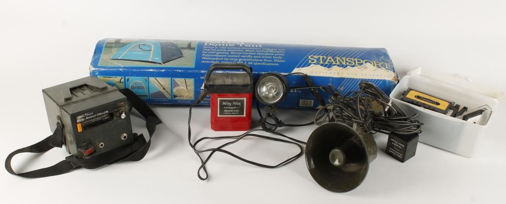 Includes: Johnny Stewart wild animal caller for predator hunting. Includes tapes, battery, spotlight and more. Also includes 3-man Astral dome tent.