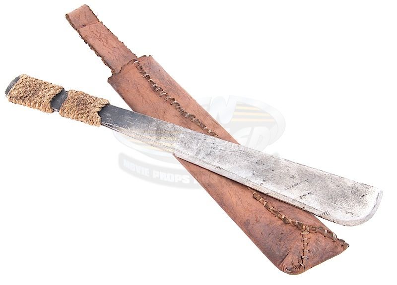 (Troublemaker Studios, 2010) This prop machete was custom-made by the production for use by Mahershala Ali as "Mombasa". The machete is made of metal with rope applied to the handle and the belt sheath is made of leather. Wear from use is present, measures 21" in length.