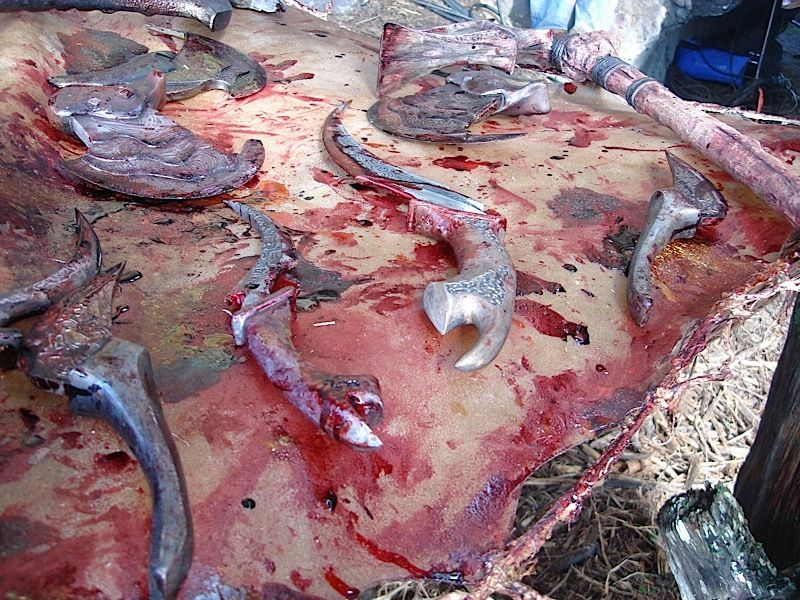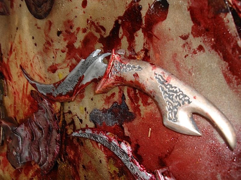 (Troublemaker Studios, 2010) This prop knife was custom-made by the production for use by various actors as "Predators". The knife is made of rubber and painted to look like metal with ornate etching on both sides of the blade and handle. Studio blood is applied, and the knife measures 19.5" in length.