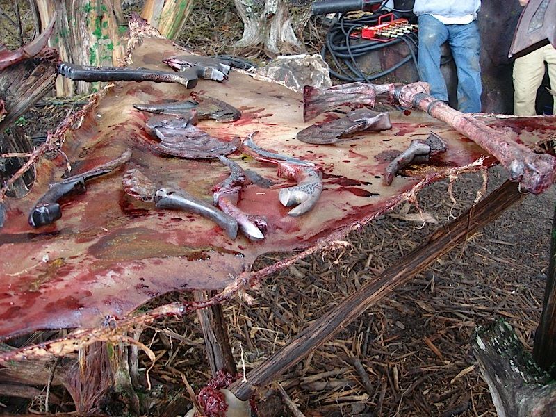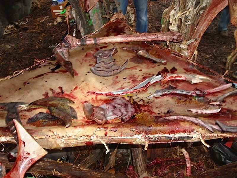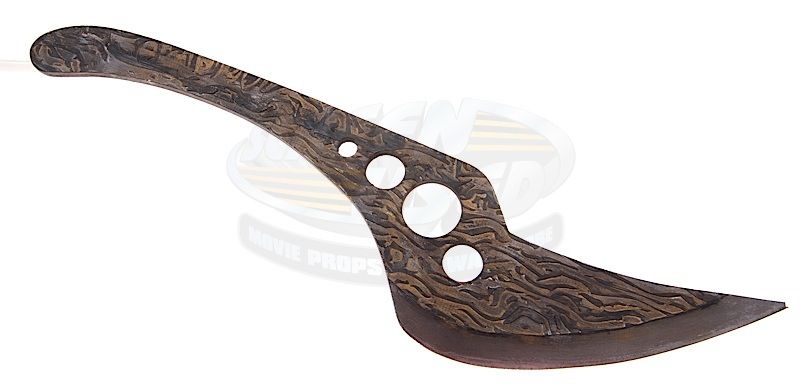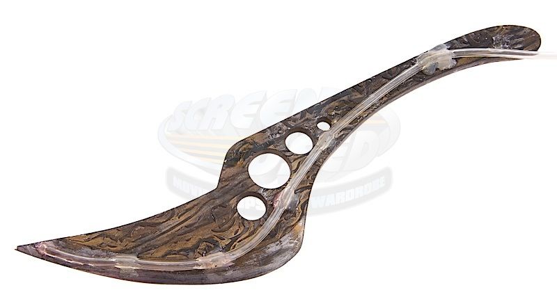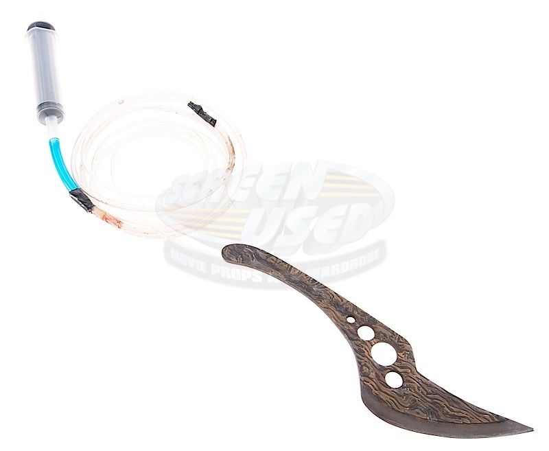 (Troublemaker Studios, 2010) This prop carving knife was custom-made by the production for use by various actors as "Predators". The knife is made of plastic and painted to look like metal with ornate etching on both sides. The knife is rigged with a plastic tube connected to a syringe that would pump studio blood to the blade in order to simulate the cutting of skin. The knife measures 10.5" in length.