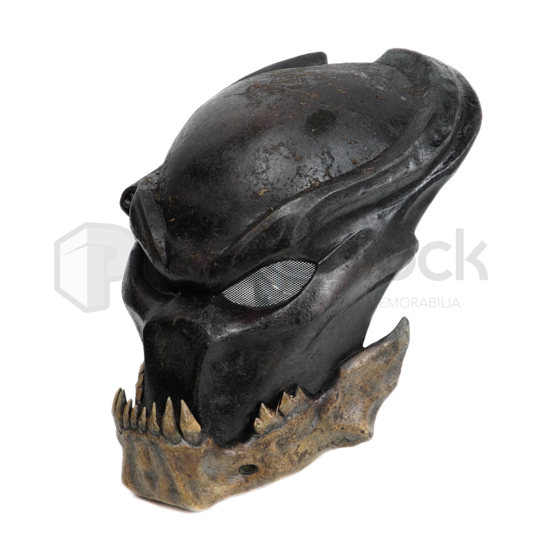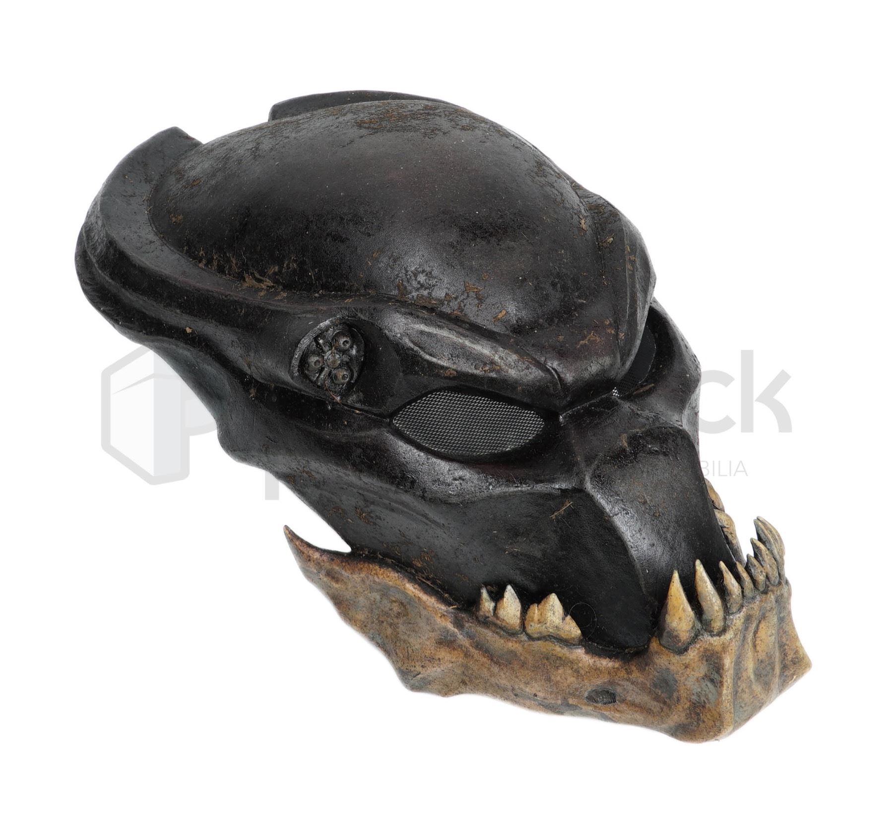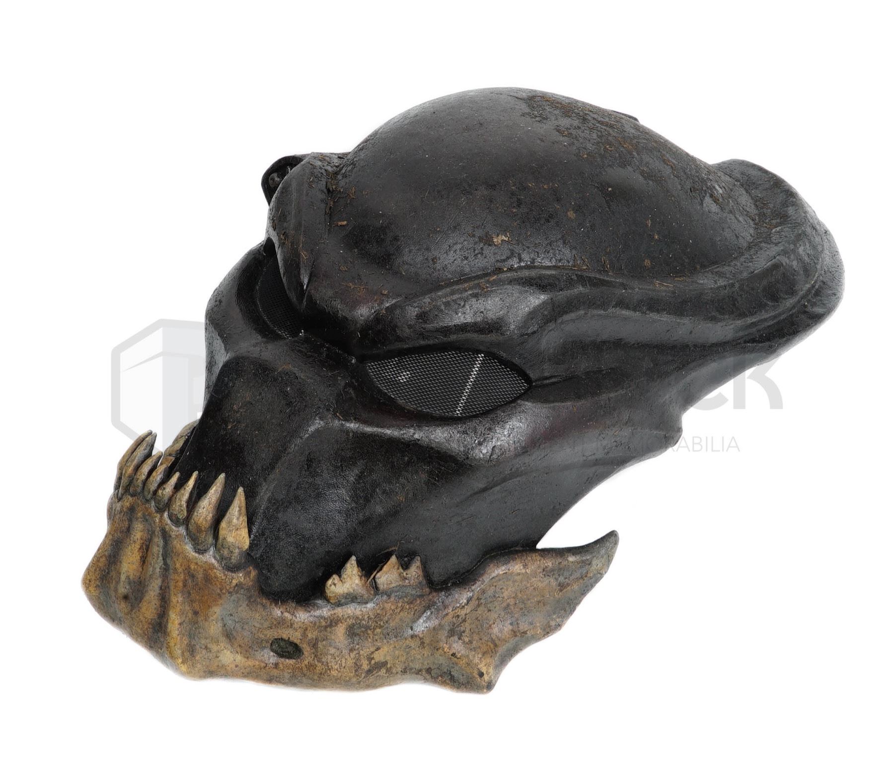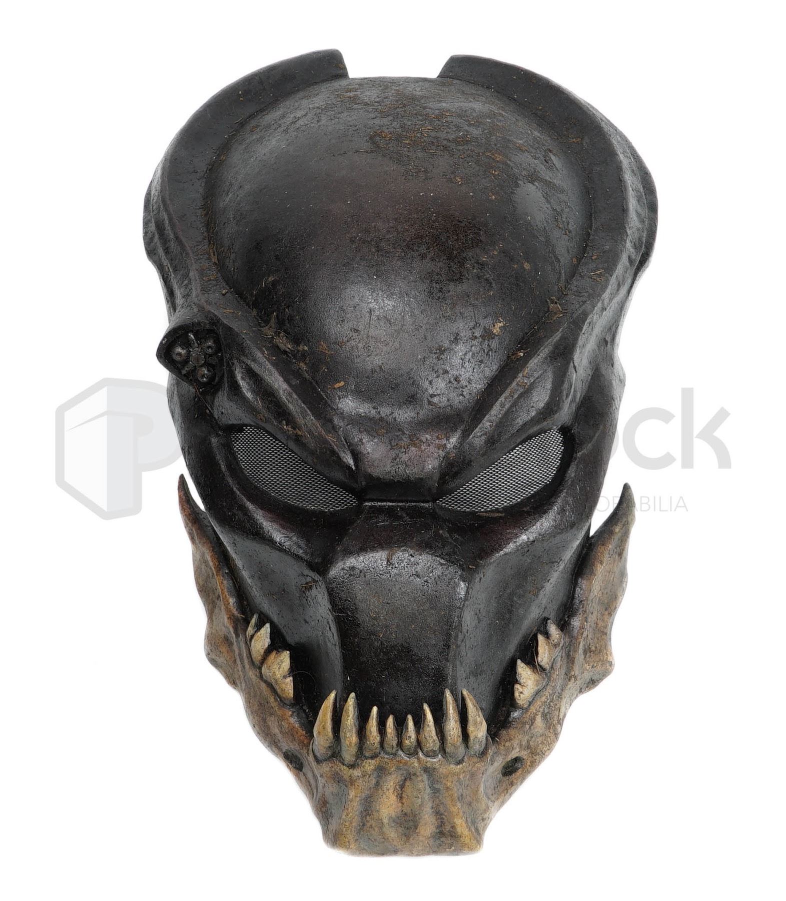 Prototype helmet of the character known as "Mr. Black" made for use in the 2010 science fiction horror film Predators. A group of elite warriors parachute into an unfamiliar jungle and are hunted by members of a merciless alien race. Although very similar to the screen sued version, this piece differs slightly and was created by the production as a prototype. Made of fiberglass, this large helmet featured the Predators signature style and is painted an aged black with silver mesh style eyes. The helmet features the characters signature "bone" jaw, featuring a large jaw bone with sharp teeth protruding front the front. This item remains in excellent, production made condition.