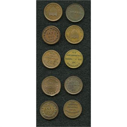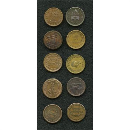<B>Predominantly Civil War Merchants.</B></I> One patriotic token is also included. All are uncertified. The lot is: <B>Fuld-NY10A-1a, R.2, MS60; Fuld-NY140A-2a, R.1, MS64 Brown; Fuld-NY630BK-2a, R.1, MS60 Brown; Fuld-NY630BQ-1b, R.1, XF; Fuld-NY630BY-1a, R.3, XF; Fuld-NY630CH-3a, R.7, MS63 Brown; Fuld-OH990A-1a, R.2, MS63 Red and Brown; Fuld-PA13C-2a, R.5, XF; Fuld-WI510E-1a, R.2, MS63 Red and Brown;</B></I> and a <B>Fuld-188/384a, R.3, VF.</B></I><BR><BR><b>Shipping:</b> Coins & Currency (<a target="_blank" href="http://www.heritageauctions.com/common/shipping.php">view shipping information</a>)