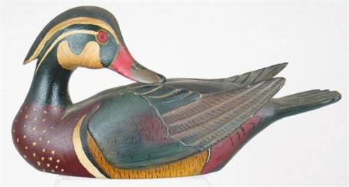 Preening half sized wood duck drake with wings lifted. In XOC with a few minor dings on the surface. Bottom reads "Bert Williams, Orleans, Male Wood Duck, March 1961, Painted by M. H. Gould". (decoy)