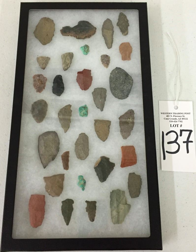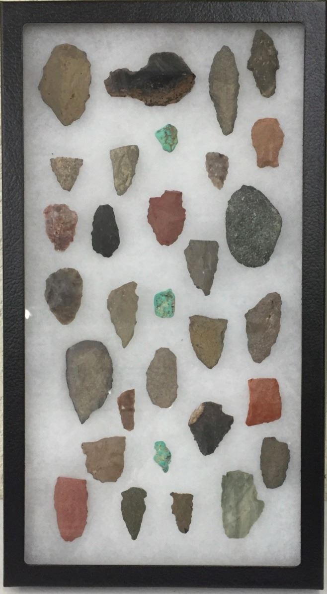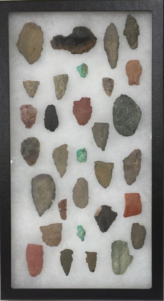 There are numerous, authentic, prehistoric arrowheads and scrapers included in this 8” x 14” shadowbox. There are also a couple of turquoise nugget accents. Please look closely at the pics as they are an important part of our description. Shipping: There will be a $7 handling / packaging fee for shipping this lot. The actual cost of postage will be added on top of that.