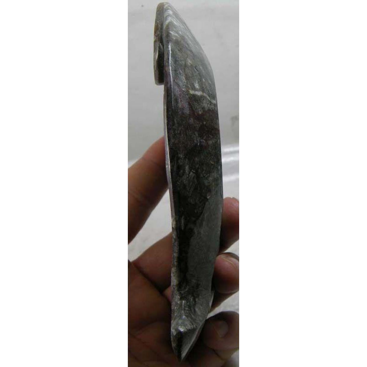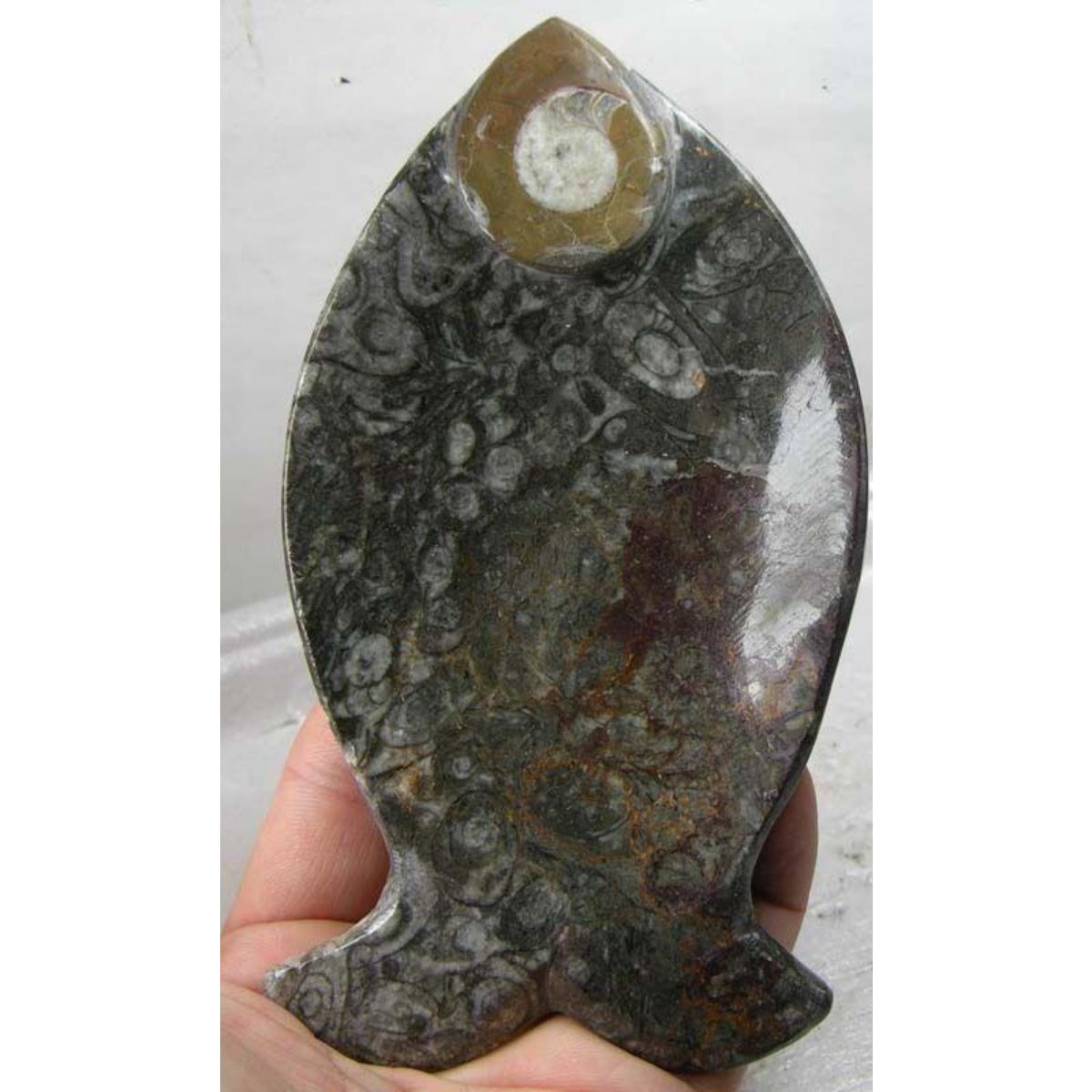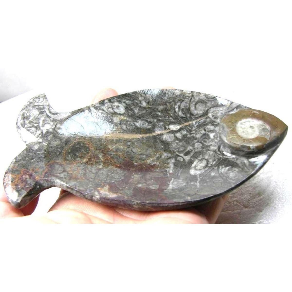 Prehistoric ammonite snail fossil, cephalopod artifact, carved in the form of a fish, ashtray or ring, trinket dish. Morocco origin. Devonian -  Cretaceous Period  419 - 66 million years ago. 5 5/8" W X 3 1/8" L.Â